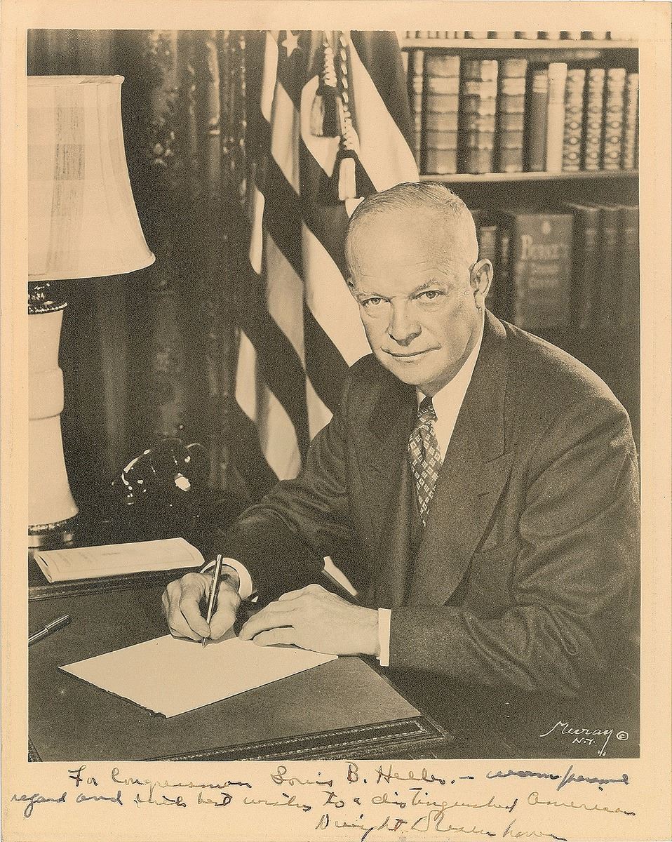 Vintage matte-finish 8 x 10 portrait of Eisenhower by Murray of New York, signed and inscribed in the lower border in fountain pen, “For Congressman Louis B. Heller—warm personal regard and with best wishes to a distinguished American, Dwight D. Eisenhower.” Eisenhower adds four words of the inscription in a different ink. In fine condition. A former senator from New York, Heller was elected to the New York Supreme Court in 1966 and served as a justice until his retirement in 1977.