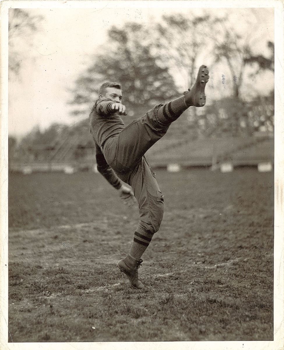 Fabulous unsigned glossy 8 x 10 press photo of Eisenhower punting during a practice at West Point for the Army football team in 1915. Reverse bears various press stamps, notations, and affixed captions which date the photo to no later than the early 1940s. In very good condition, with scattered overall creasing and impressions from notations on reverse.