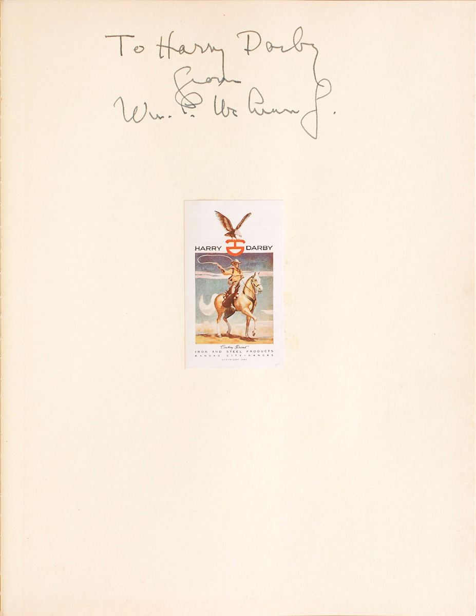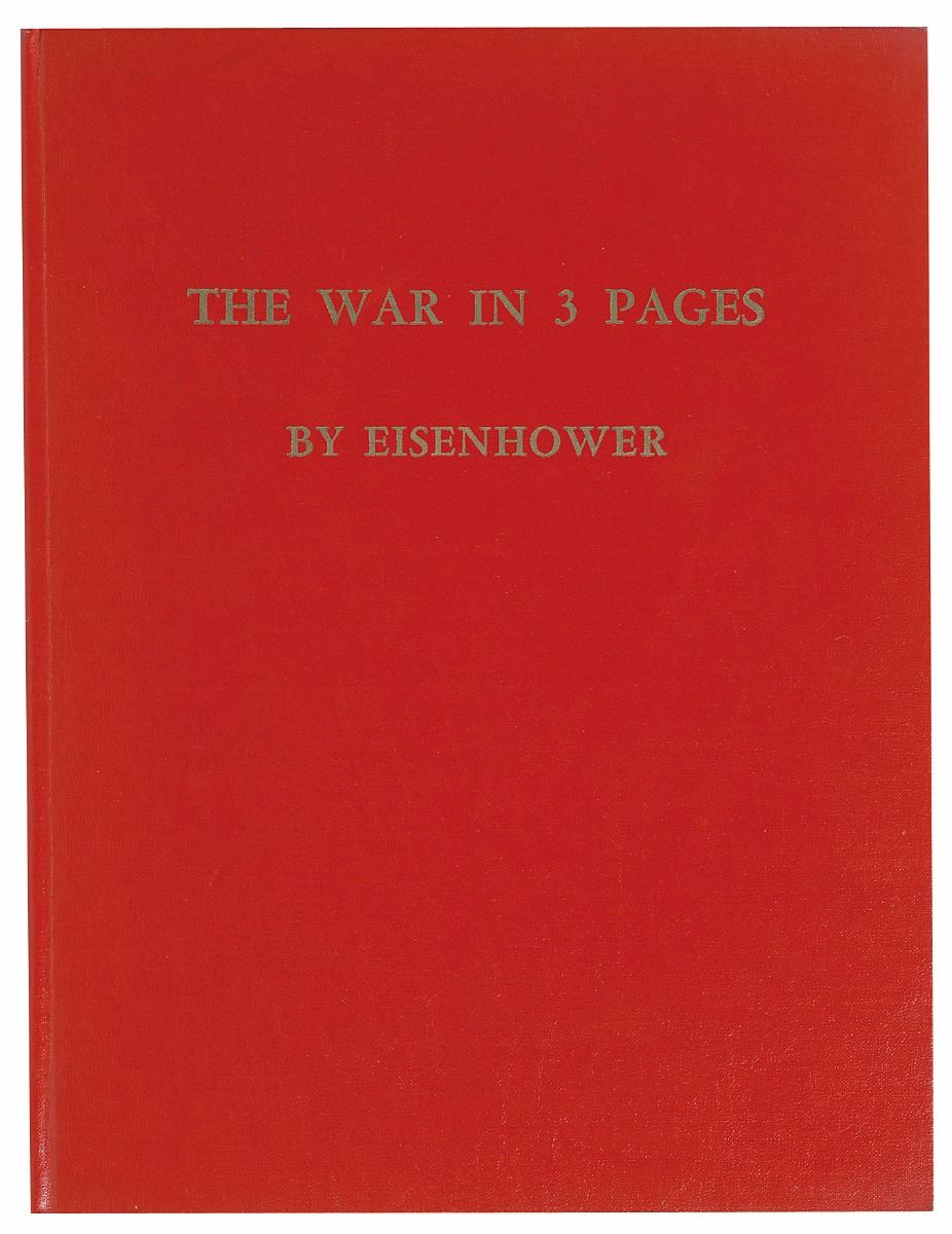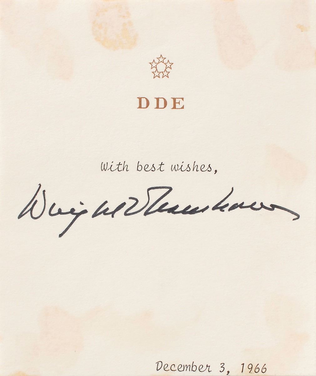 Fountain pen signature, “Dwight D. Eisenhower,” on a 3.75 x 5 bookplate bearing his initials and a typed date of December 3, 1966. In very good condition, with show-through from toned mounting residue to reverse. Accompanied by a limited edition hardcover book entitled The War in 3 Pages by Eisenhower, signed and inscribed by the publisher William L. McLean, Jr., to Kansas Senator Harry Darby, privately printed in an edition of only 85 copies.