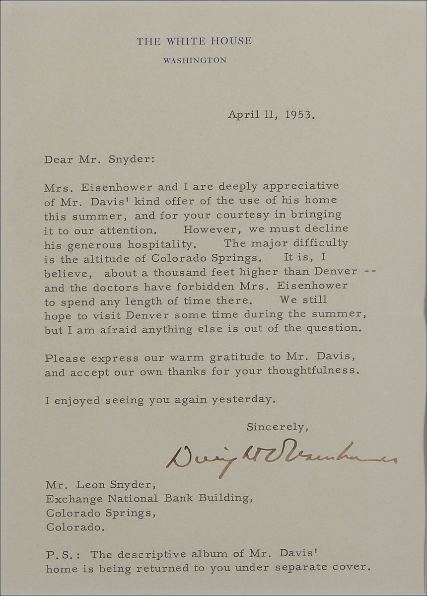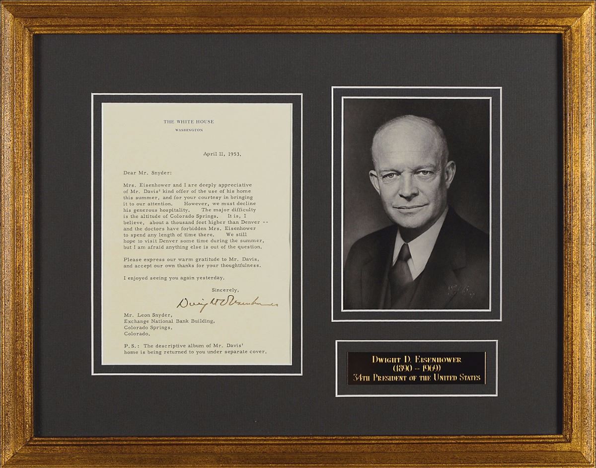 TLS as president, one page, 5.75 x 8, White House letterhead, April 11, 1953. Letter to Leon Snyder, in part: “Mrs. Eisenhower and I are deeply appreciative of Mr. Davis’ kind offer of the use of his home this summer…However, we must decline his generous hospitality. The major difficulty is the altitude of Colorado Springs. It is, I believe, about a thousand feet higher than Denver—and the doctors have forbidden Mrs. Eisenhower to spend any length of time there.” Archivally double-matted and framed with a Pach Bros. portrait and name plaque to an overall size of 18.5 x 14.5. In fine condition.