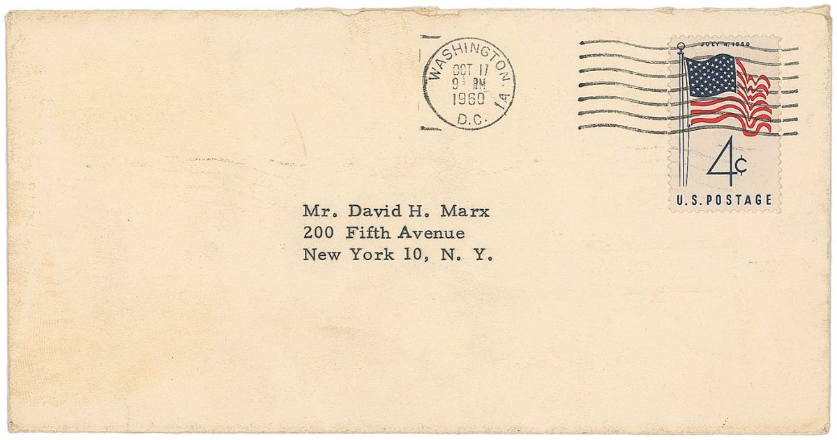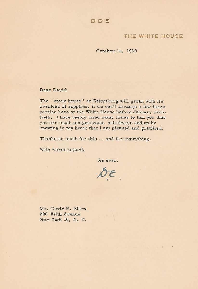TLS as president signed “D. E.,” one page, 7 x 10.25, White House letterhead, October 14, 1960. Letter to David Marx, of the famous toy manufacturer Louis Marx and Company, in full: “The ‘store house’ at Gettysburg will groan with its overload of supplies, if we can’t arrange a few large parties here at the White House before January twentieth. I have feebly tried many times to tell you that you are much too generous, but always end up by knowing in my heart that I am pleased and gratified. Thanks so much for this—and for everything.” In fine condition. Accompanied by the original mailing envelope.