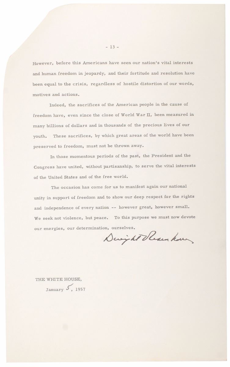 Exceedingly rare TMS, thirteen pages, 8.25 x 13.25, January 5, 1957. An original White House manuscript of the important address to Congress in which he proposed the ‘Eisenhower Doctrine,’ typed on official legal paper watermarked with the presidential seal. In addition to speech copies for the vice president and speaker of the House, signed manuscripts were also given to the Congressional Roll Call office for their records. In part: “The Middle East has abruptly reached a new and critical stage in its long and important history…Since the First World War there has been a steady evolution toward self-government and independence…The evolution to independence has in the main been a peaceful process. But the area has been often troubled. Persistent crosscurrents of distrust and fear with raids back and forth across national boundaries have brought about a high degree of instability in much of the Mid East…Russia's rulers have long sought to dominate the Middle East…The reason for Russia's interest in the Middle East is solely that of power politics. Considering her announced purpose of Communizing the world, it is easy to understand her hope of dominating the Middle East… The action which I propose would have the following features…It would, first of all, authorize the United States to cooperate with and assist any nation or group of nations in the general area of the Middle East in the development of economic strength dedicated to the maintenance of national independence…undertake in the same region programs of military assistance and cooperation with any nation or group of nations which desires such aid…to include the employment of the armed forces of the United States to secure and protect the territorial integrity and political independence of such nations, requesting such aid, against overt armed aggression from any nation controlled by International Communism.” In fine condition. The consignor notes that this item was signed for, and acquired directly from, a Roll Call Senior Official (who worked under Eisenhower, Kennedy, and Johnson), and that this copy of the speech was required for his records.