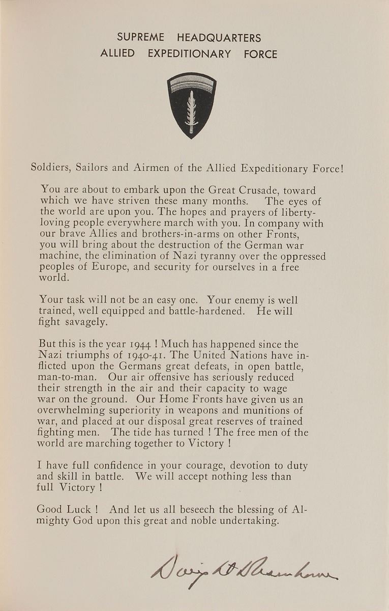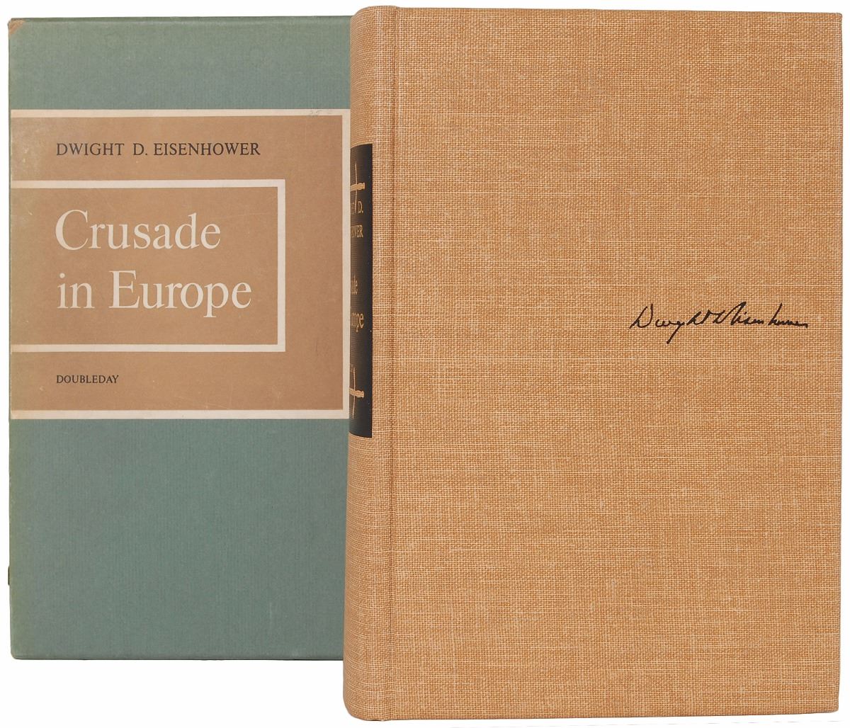Signed book: Crusade in Europe. First edition, limited issue, numbered 299/1426. Garden City, NY: Doubleday, 1948. Hardcover with slipcase and original acetate jacket, 7 x 10, 559 pages. Signed in fountain pen on a special prefatory page reproducing Eisenhower’s ‘Order of the Day’ on D-Day, “Dwight D. Eisenhower.” Autographic condition: fine. Book condition: VG+/None, in a VG slipcase. A highly sought-after volume.