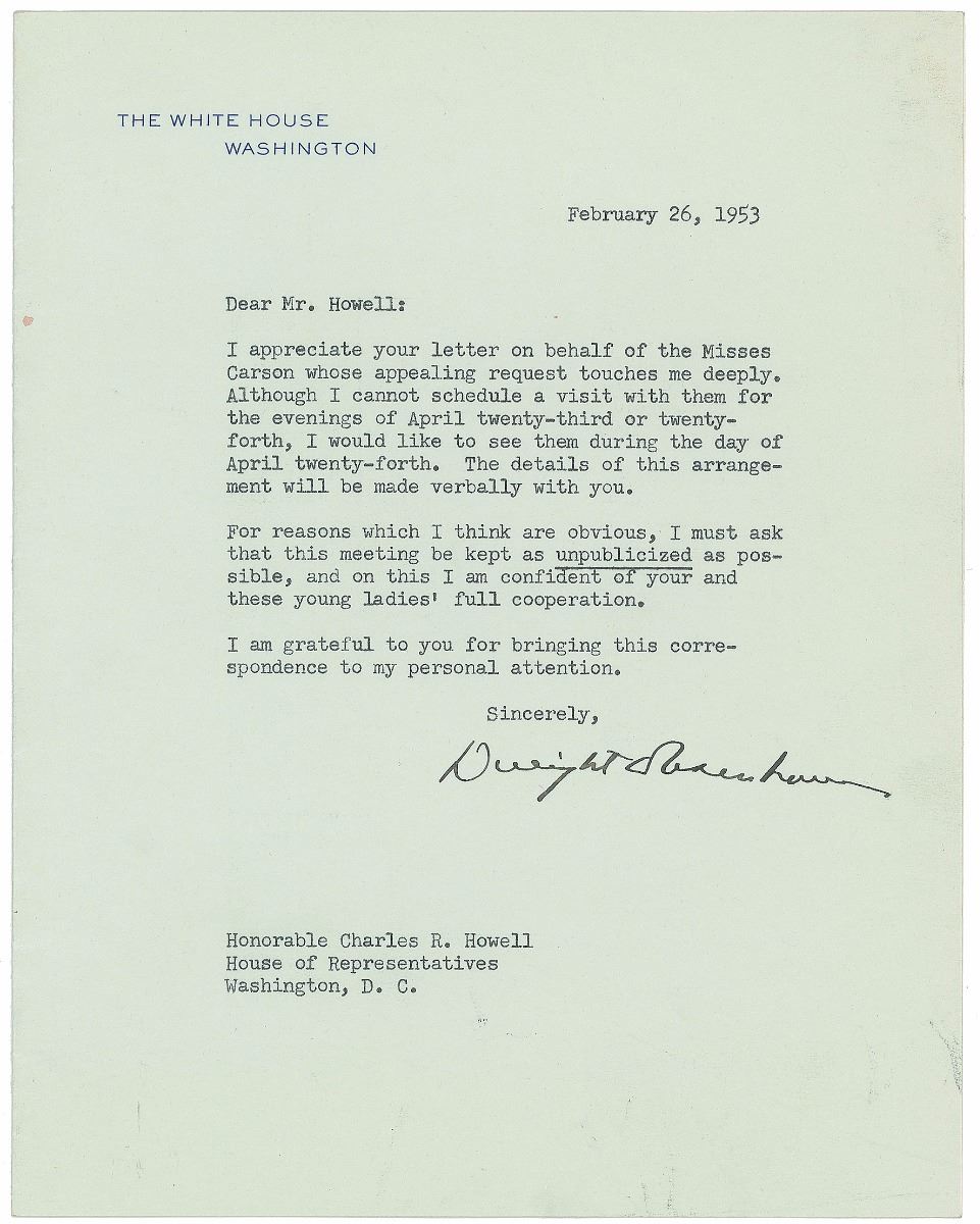 TLS as president, one page, 7 x 8.75, White House letterhead, February 26, 1953. Letter to Congressman Charles R. Howell concerning a visit from a blind girl, in full: “I appreciate your letter on behalf of the Misses Carson whose appealing request touches me deeply. Although I cannot schedule a visit with them for the evenings of April twenty-third or twenty-forth [sic], I would like to see them during the day of April twenty-forth. The details of this arrangement will be made verbally with you. For reasons which I think are obvious, I must ask that this meeting be kept as unpublicized as possible, and on this I am confident of your and these young ladies’ full cooperation. I am grateful to you for bringing this correspondence to my personal attention.” In fine condition, with trivial soiling. Accompanied by a packet of copied letters, the correspondence referenced by Eisenhower. Provenance: The Everett Fisher Collection.