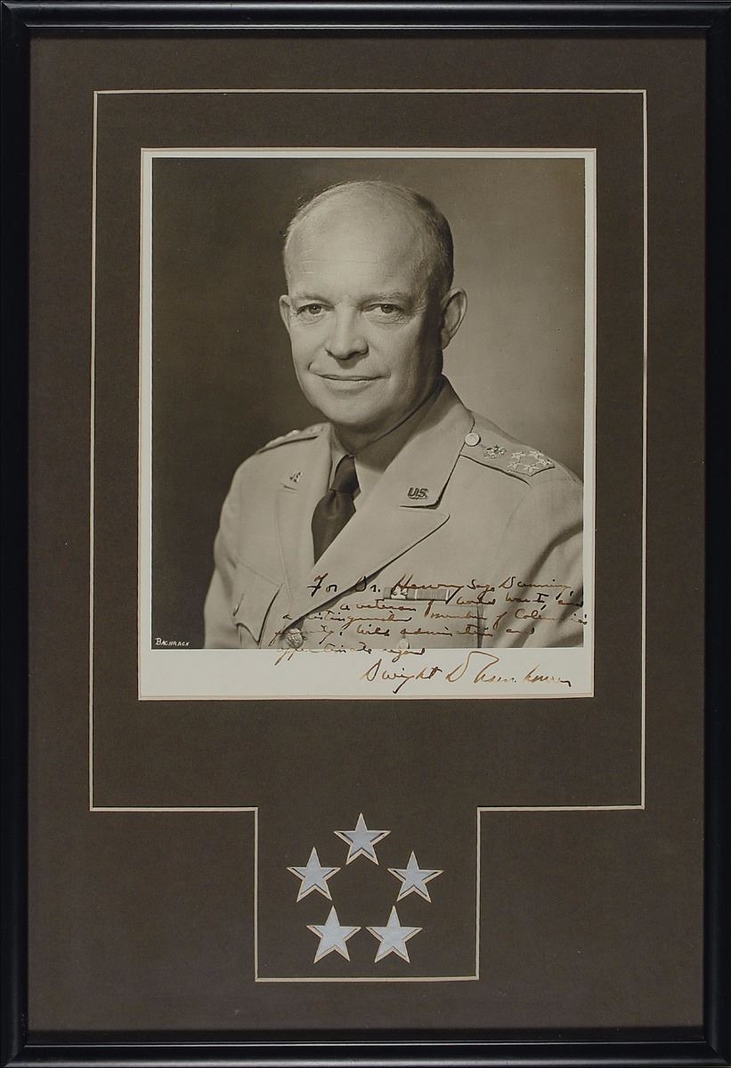 Vintage matte-finish 7.75 x 9.5 Bachrach portrait photo of General Eisenhower in his uniform, signed and inscribed in fountain pen, “For Dr. Henry Sage Dunning, a veteran of World War I, and a distinguished member of Columbia’s family, with admiration and affectionate regard, Dwight D. Eisenhower.” Appealingly double-matted and framed. In fine condition, with slight skipping of ink to a couple of letters in “Eisenhower.” Dunning, an oral surgeon, was a member of the committee appointed by President Nicholas Murray Butler in 1916 to deliberate the idea of founding a dental school at Columbia University.