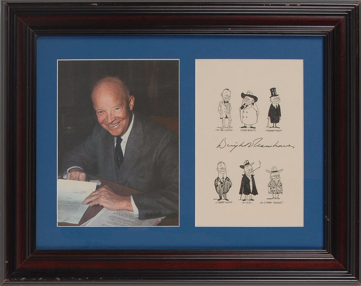 An original hand-drawn cartoon portraying Eisenhower dressed as six presidents of the past, 5.75 x 9, signed across the middle in fountain pen by Eisenhower. A clipping on the reverse of the frame attributes the comic to “Vicky” and notes that it appeared in the London News Chronicle. Nicely matted and framed beside a portrait. In fine condition.