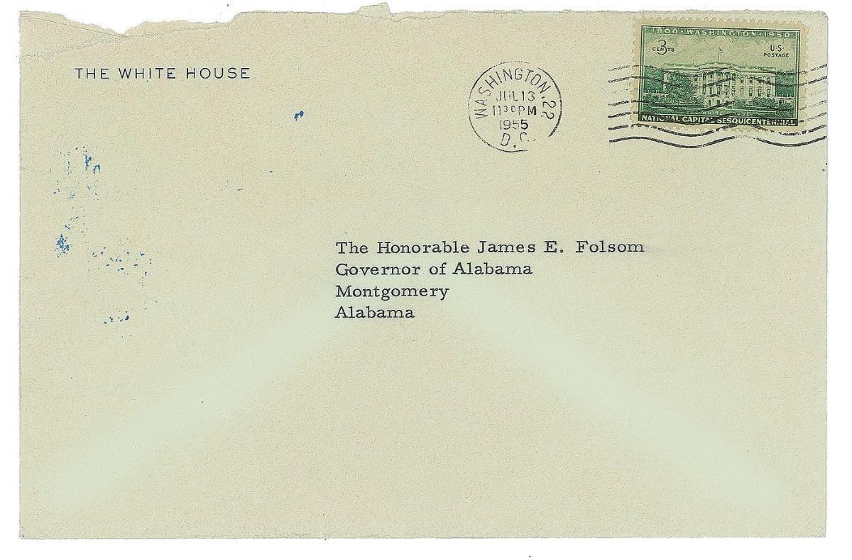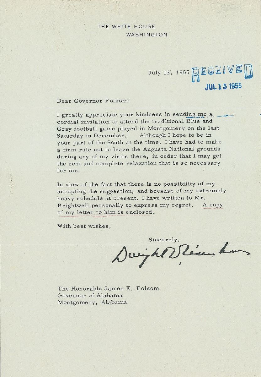 TLS as president, one page, 7 x 10.25, White House letterhead, July 13, 1955. Letter to Alabama Governor James Folsom, in full: “I greatly appreciate your kindness in sending me a cordial invitation to attend the traditional Blue and Gray football game played in Montgomery on the last Saturday in December. Although I hope to be in your part of the South at the time, I have had to make a firm rule not to leave the Augusta National grounds during any of my visits there, in order that I may get the rest and complete relaxation that is so necessary for me. In view of the fact that there is no possibility of my accepting the suggestion, and because of my extremely heavy schedule at present, I have written to Mr. Brightwell personally to express my regret. A copy of my letter to him is enclosed.” In fine condition. Accompanied by the original mailing envelope. The Civil Rights Movement presented tense moments for both President Eisenhower and Governor Folsom, with the latter, a noted moderate on racial equality, facing the Martin Luther King, Jr.-orchestrated Montgomery Bus Boycott by year’s end.