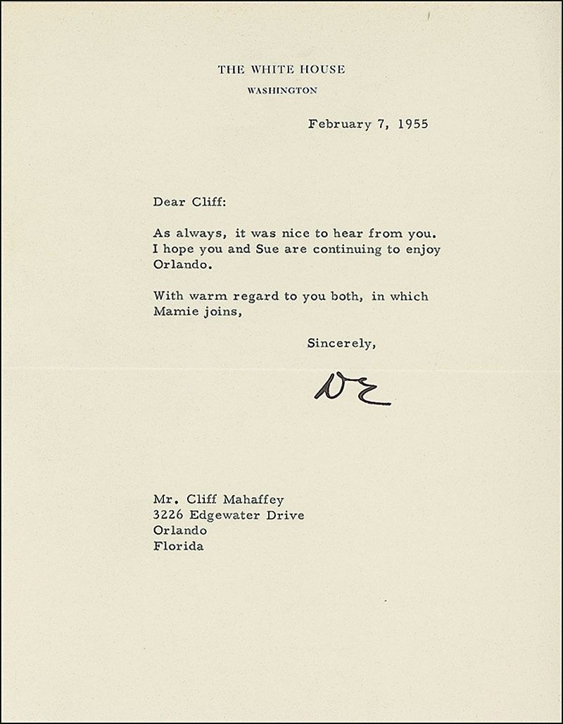 TLS as president signed “D. E.,” one page, 6.75 x 8.75, White House letterhead, February 7, 1955. Letter to Cliff Mahaffey, in full: “As always, it was nice to hear from you. I hope you and Sue are continuing to enjoy Orlando. With warm regard to you both, in which Mamie joins.” In fine condition. Accompanied by an ink signature, “Mamie Doud Eisenhower,” on an off-white 3.75 x 2.75 card, as well as the original mailing envelope for the signature.