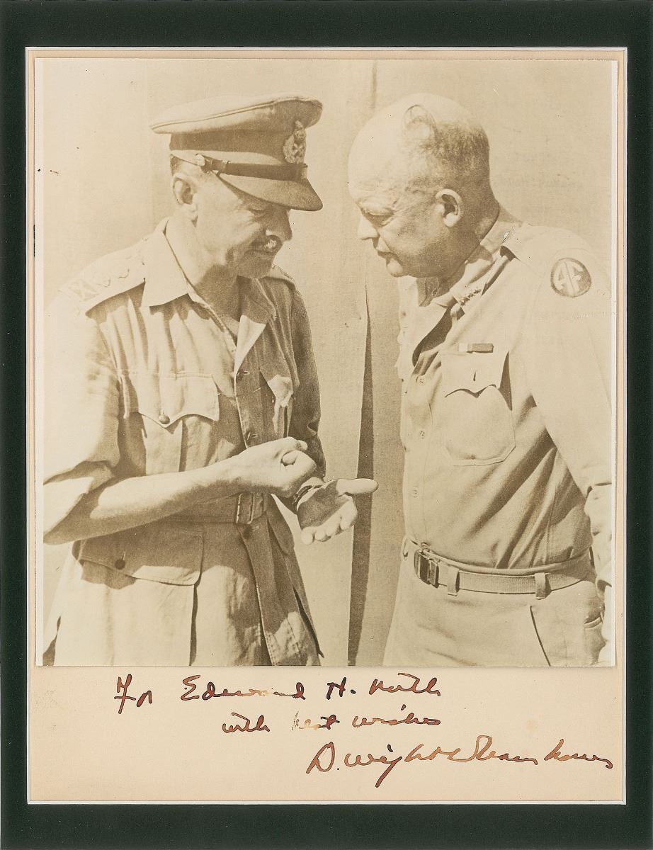 Matte-finish 8 x 10 photo, signed and inscribed in the lower border in fountain pen, “For Edward H. North, with best wishes, Dwight D. Eisenhower.” While the signed photo is a standard pose of Eisenhower at his desk, a second photo of Ike with General H. R. Alexander has been trimmed and affixed over the image area. Matted and in very good to fine condition.