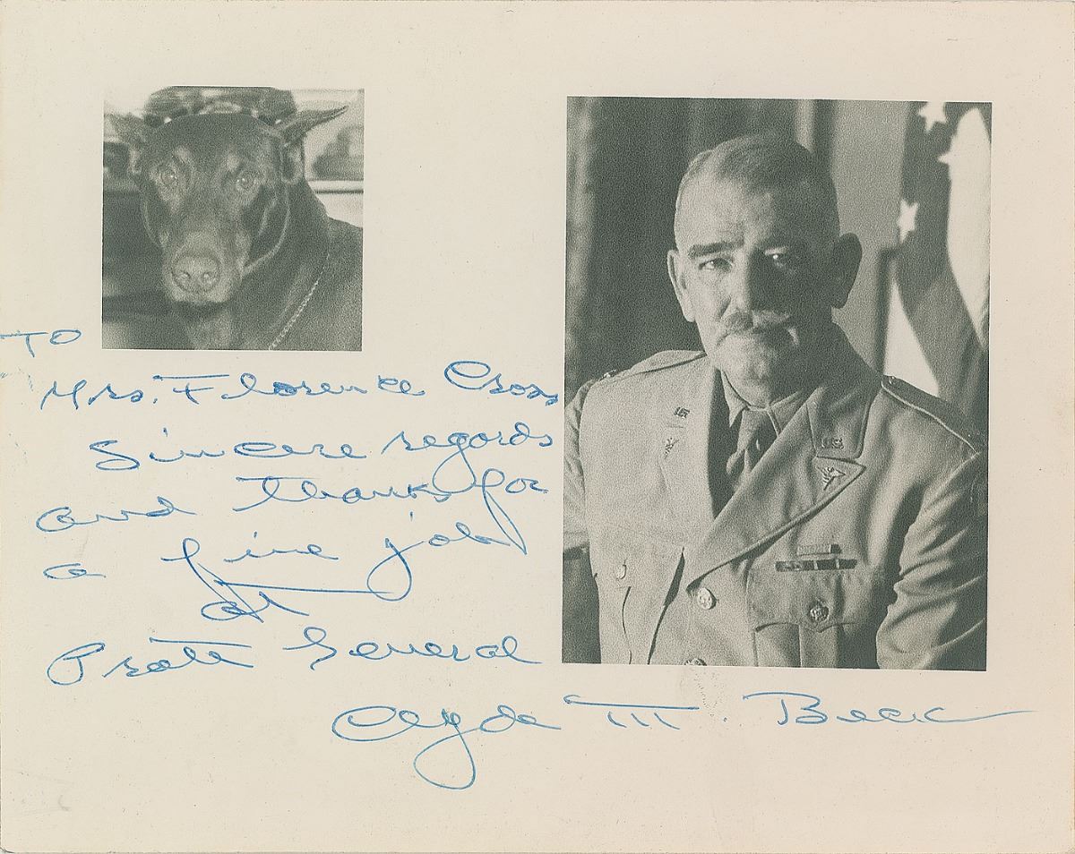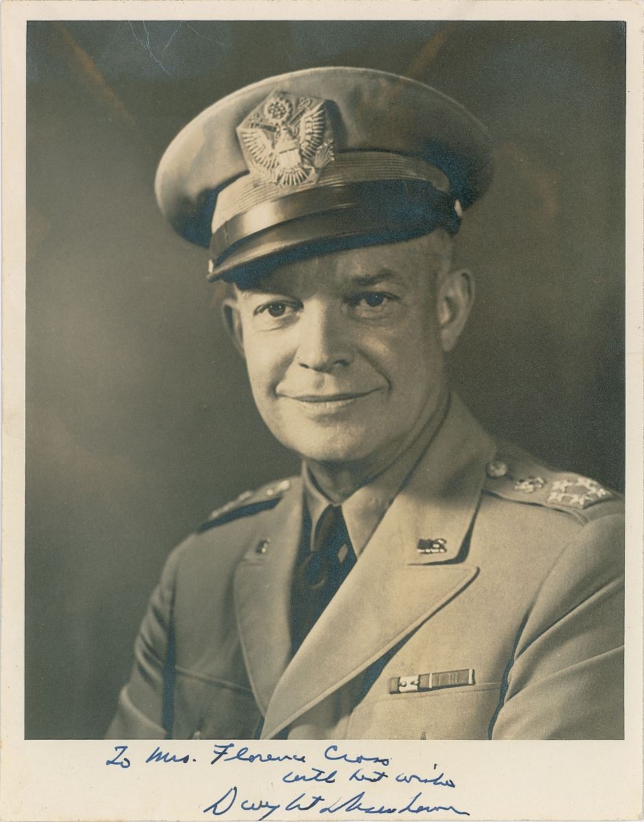 Matte-finish 7.75 x 10 portrait of Eisenhower in his five-star uniform, signed and inscribed in fountain pen, “To Mrs. Florence Cross, with best wishes, Dwight D. Eisenhower.” In very good to fine condition, with light creasing and silvering, primarily along the top edge. Accompanied by a photo signed and inscribed by General Clyde M. Beck.