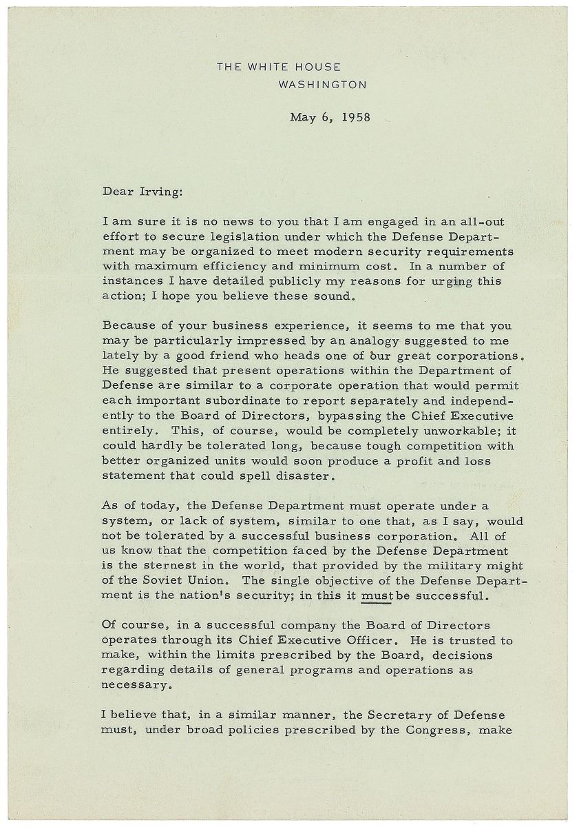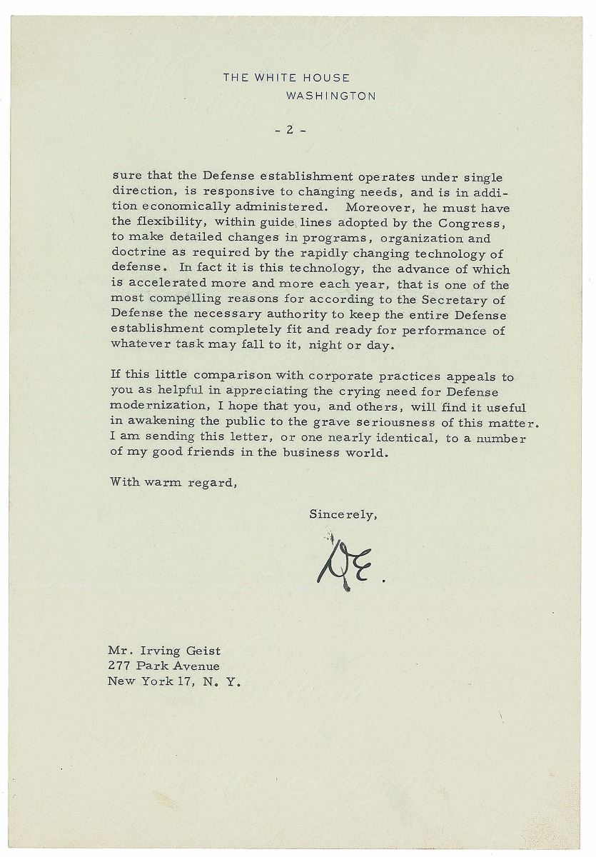 TLS as president signed “D. E.,” two pages, 7 x 10.25, White House letterhead, May 6, 1958. Letter to businessman Irving Geist. In part: “I am sure it is no news to you that I am engaged in an all-out effort to secure legislation under which the Defense Department may be organized to meet modern security requirements with maximum efficiency and minimum cost…As of today, the Defense Department must operate under a system, or lack of system, similar to one that, as I say, would not be tolerated by a successful business corporation. All of us know that the competition faced by the Defense Department is the sternest in the world, that provided by the military might of the Soviet Union. The single objective of the Defense Department is the nation’s security; in this it must be successful…In a successful company the Board of Directors operates through its Chief Executive Officer…I believe that, in a similar manner, the Secretary of Defense must, under broad policies prescribed by the Congress, make sure that the Defense establishment operates under a single direction.” In fine condition, with a stray ink mark near the signature. Eisenhower oversaw the first major reorganization of the Department of Defense in 1958, which streamlined departments and channels of authority.