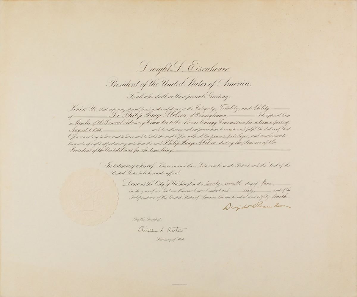 Partly-printed DS as president, one page, 23 x 19, June 27, 1960. President Eisenhower appoints Dr. Philip Hauge Abelson “a Member of the General Advisory Committee to the Atomic Energy Commission for a term expiring August 1, 1966.” Signed at the conclusion by Eisenhower and countersigned by Secretary of State Christian Herter. Document is affixed to an identical size mount. Mild toning and foxing, primarily to edges, and a bit of light feathering to end of signature, otherwise fine condition. The white seal is lightly toned, but crisp and intact. Authorized by the Atomic Energy Act of 1946, the Atomic Energy Commission assumed the operations of the Manhattan Project which began in 1942 to produce the first atomic bomb. Abelson, a physical chemist, proposed the gas diffusion process for separating uranium-235 from uranium-238 and, in 1940, in collaboration with physicist Edwin M. McMillan, discovered the element neptunium. He would later go on to serve as the editor of Science magazine from 1962–1984. A high-level appointment for a highly decorated and respected scientist, who played an important role in atomic development.