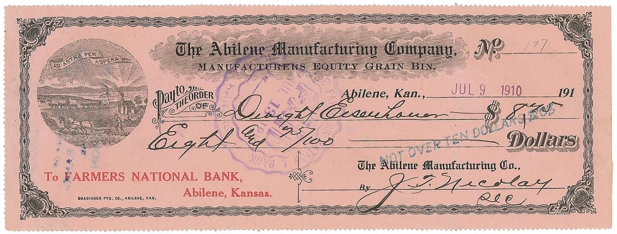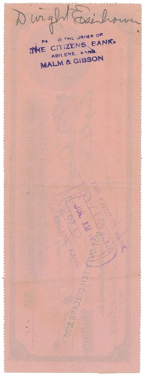 Abilene Manufacturing Company business check, 8.5 x 3, filled out by a company secretary, payable to Dwight Eisenhower for $8.75, July 9, 1910, endorsed on the reverse in pencil, “Dwight Eisenhower.” In fine condition, with expected check wear. Accompanied by a full letter of authenticity from PSA/DNA.
