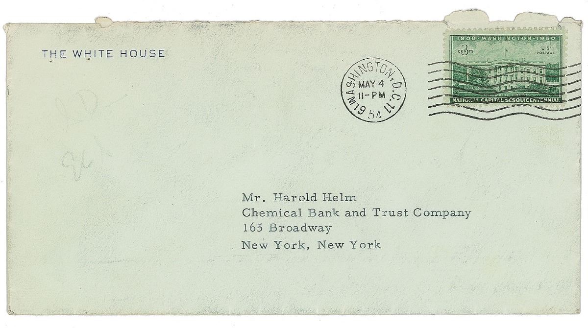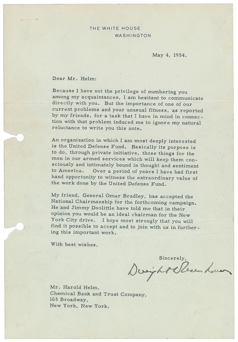 TLS as president, one page, 7 x 10.25, White House letterhead, May 4, 1954. Letter to Harold Helm, in part: “An organization in which I am most deeply interested is the United Defense Fund. Basically its purpose is to do, through private initiative, those things for the men in our armed services which will keep them consciously and intimately bound in thought and sentiment to America. Over a period of years I have had first hand opportunity to witness the extraordinary value of the work done by the United Defense Fund. My friend, General Omar Bradley, has accepted the National Chairmanship for the forthcoming campaign. He and Jimmy Doolittle have told me that in their opinion you would be an ideal chairman for the New York City drive. I hope most strongly that you will find it possible to accept and to join with us in furthering this important work.” Trivial soiling, slight horizontal bends and creasing, staple holes to upper left corner, and tears to filing holes, otherwise fine condition. Accompanied by the original mailing envelope.
