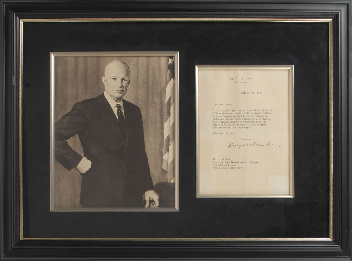 TLS as president, one page, 6 x 8.25, White House letterhead, October 24, 1956. Letter to comedian and talk show host Jack Paar, in full: “I truly enjoyed your appearance at the seventy-fifth anniversary dinner of the United Brotherhood of Carpenters and Joiners of America, and send you my warm thanks for providing a very relaxing and pleasant interlude in the midst of the political and official activities that crowd my life these days.” Matted and framed with an image of Ike to an overall size of 23.5 x 17.25. In very good to fine condition, with light creasing, and a small block of discoloration to the lower right corner.