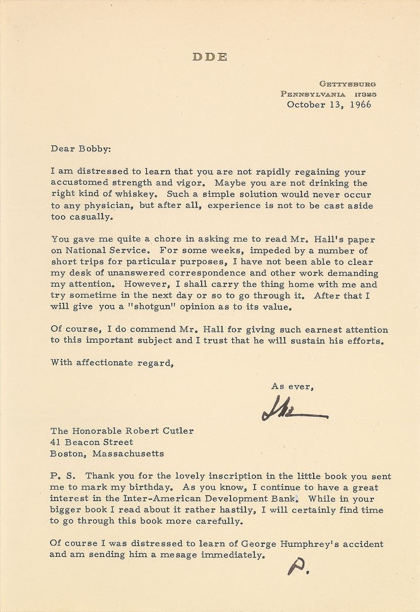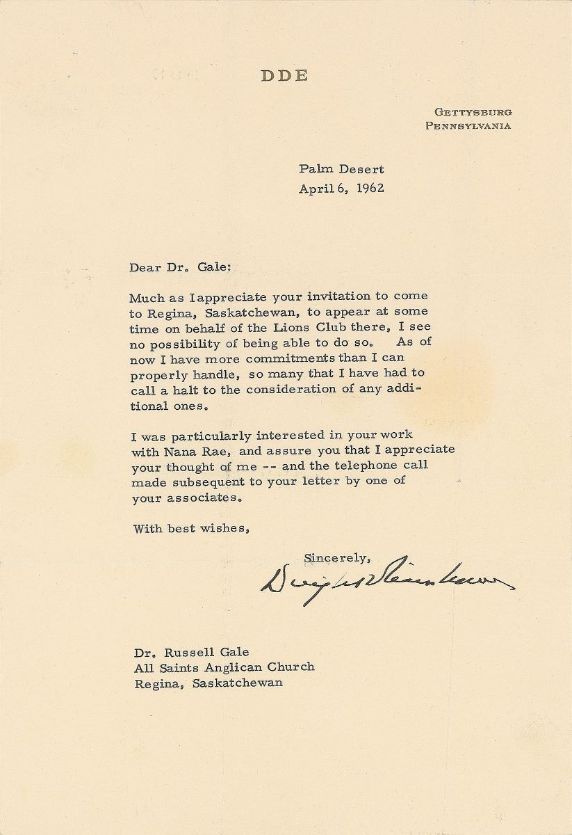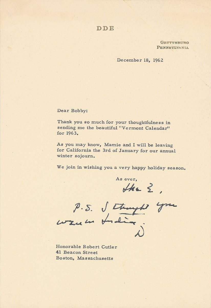 Collection of three TLSs, each one page, personal letterhead, dated from 1962 to 1966. The first, signed “Dwight D. Eisenhower,” in part: “Much as I appreciate your invitation to come to Regina, Saskatchewan…I see no possibility of being able to do so.” The second, signed “Ike E.,” in part: “Thank you so much for your thoughtfulness in sending me the beautiful ‘Vermont Calendar’ for 1963,” with a handwritten postscript, “P.S. I thought you were in India. D.” The third, signed “Ike,” in part: “I am distressed to learn that you are not rapidly regaining your accustomed strength and vigor. Maybe you are not drinking the right kind of whiskey,” with a typed postscript initialed, “D.” In overall fine condition, with a light stain to the fully-signed letter.