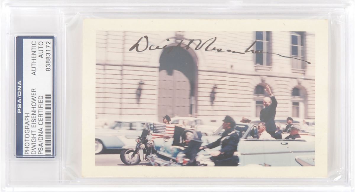 Color glossy 5 x 3.5 candid Kodacolor photo of Ike’s motorcade, boldly signed across the top in fountain pen. Encapsulated in a plastic PSA/DNA authentication holder. In fine condition.