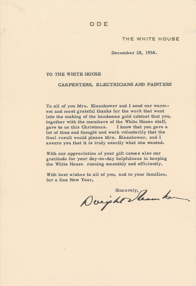 TLS, as president, one page, 7.25 x 10.25, embossed White House letterhead, December 28, 1958. A thank you letter “To the White House Carpenters, Electricians and Painters.” In part: “Mrs. Eisenhower and I send our warmest and most grateful thanks for the work that went into the making of the handsome gold cabinet that you, together with members of the White House staff, gave to us this Christmas…With our appreciation of your gift comes also our gratitude for your day-to-day helpfulness in keeping the White House running smoothly and efficiently." In fine condition, with a tiny filing hole. Accompanied by the original transmittal envelope.