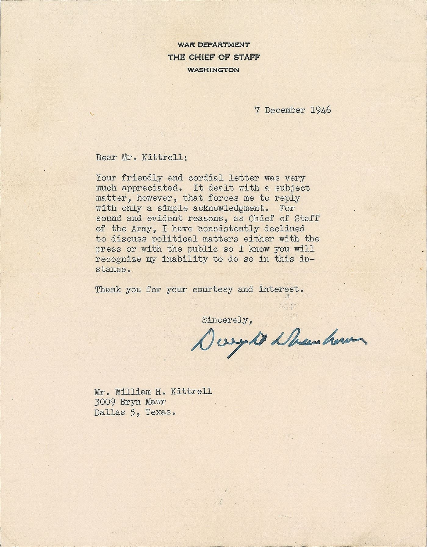 TLS, one page, 7 x 9, War Department, Chief of Staff, Washington letterhead, December 7, 1946. Letter to Mr. William H. Kittrell, in part: "Your friendly and cordial letter was very much appreciated. It dealt with a subject matter, however, that forces me to reply with only a simple acknowledgment. For sound and evident reasons, as Chief of Staff of the Army, I have consistently declined to discuss political matters either with the press or with the public so I know you will recognize my inability to do so in this instance." In very good condition, with overall creasing.