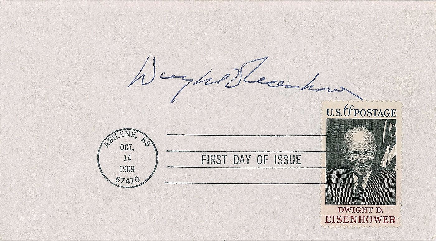 FDC postmarked Abilene, Kansas, October 14, 1969, on what would have been Ike's 79th birthday, signed in black ballpoint. In very fine condition. Eisenhower passed away on March 28, 1969.