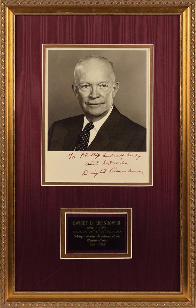 Vintage matte-finish 7.25 x 9.5 bust-length portrait of Eisenhower, signed and inscribed in the lower border in fountain pen, "with best wishes, Dwight D. Eisenhower.” Double-matted and framed with an engraved plaque to an overall size of 13.75 x 21.75. In fine condition.