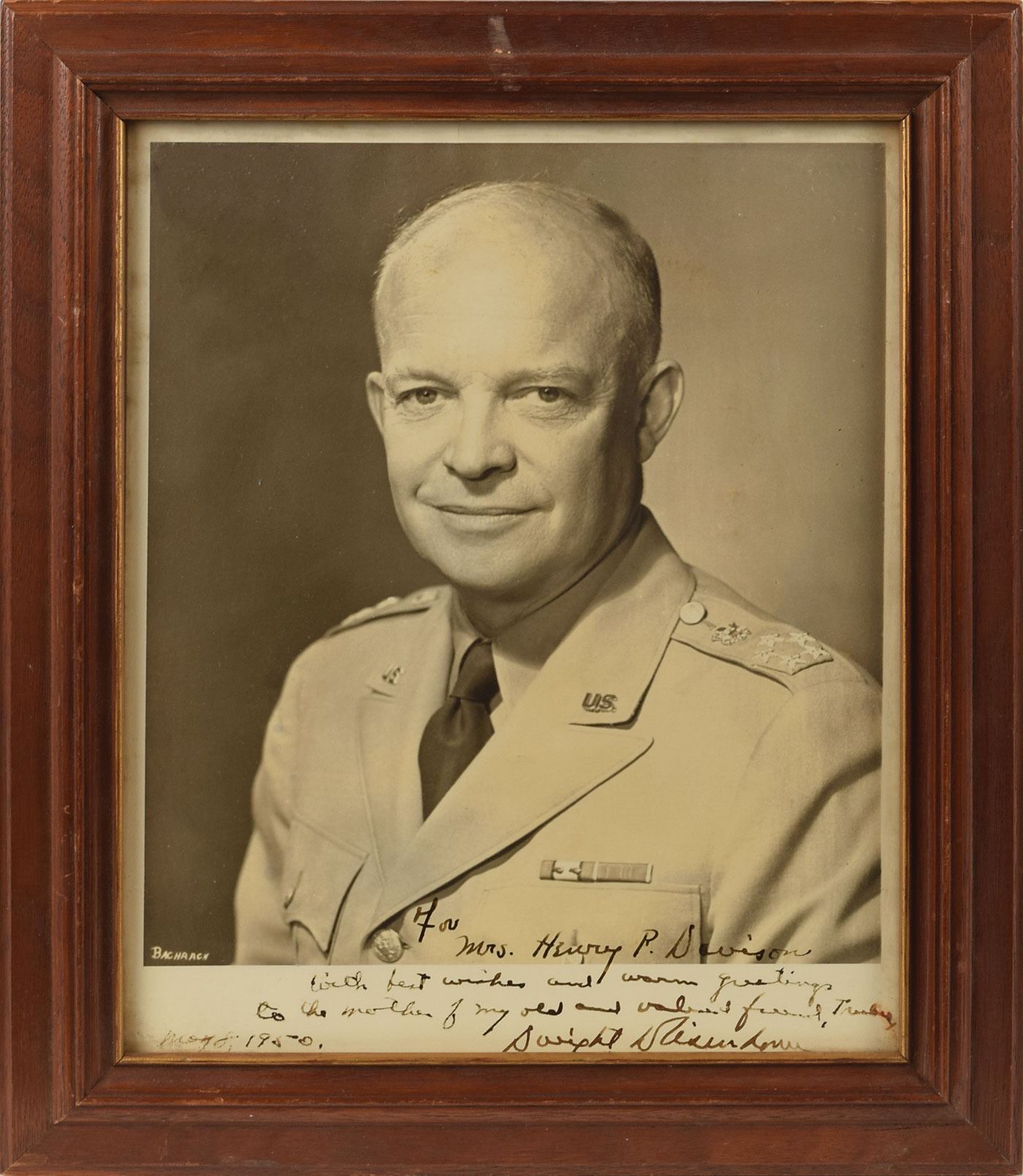 Vintage matte-finish 7.75 x 9.75 Bachrach portrait of Eisenhower in a bust-length pose and wearing his five-star military uniform, signed and inscribed in the lower border in fountain pen, "For Mrs. Henry P. Davison, with best wishes and warm greetings to the mother of my old and valued friend, truly, Dwight D. Eisenhower, May 8, 1950.” Framed to a slightly larger size. In fine condition.