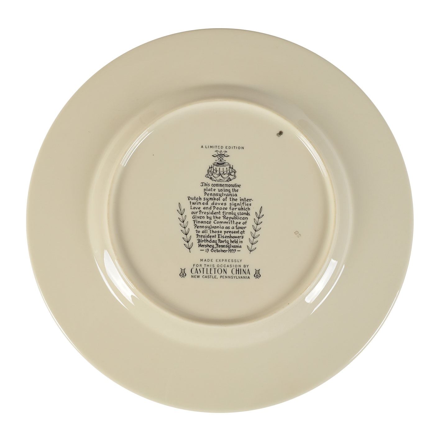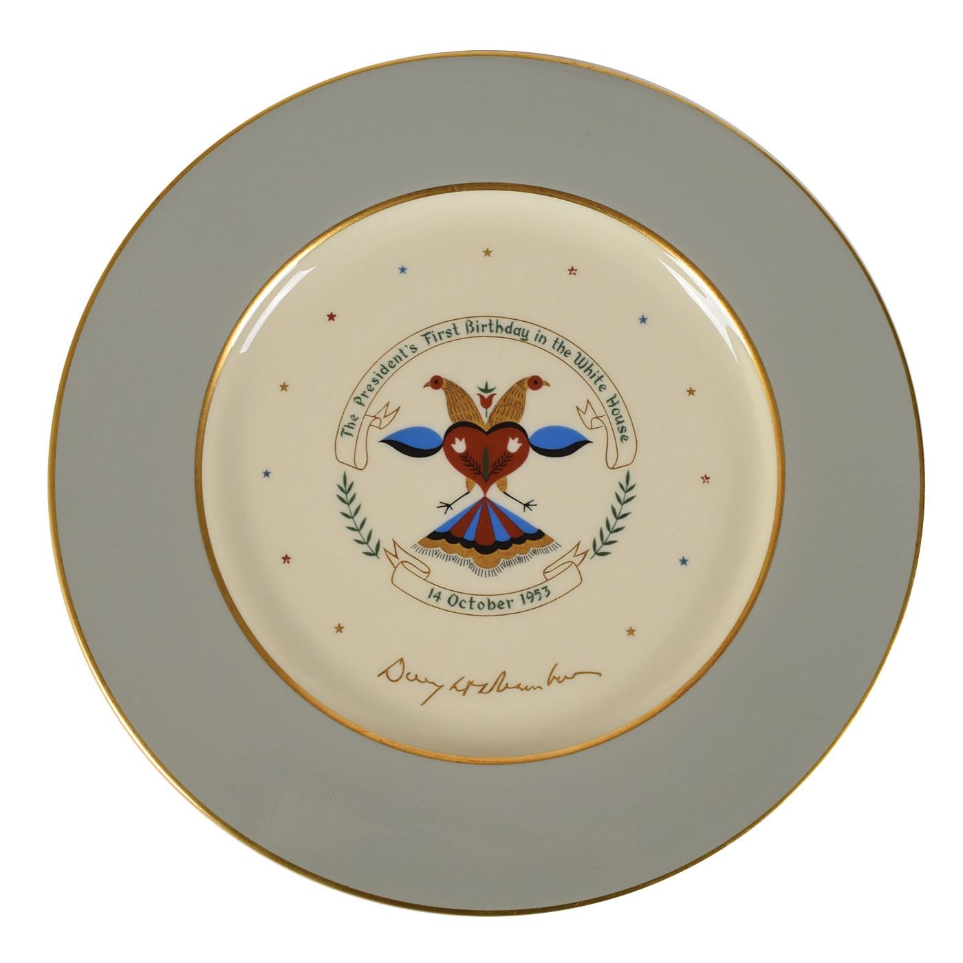 Limited edition commemorative china plate produced by Castleton China of New Castle, Pennsylvania, measuring 10.75? in diameter, commemorating Eisenhower’s first birthday in the White House on October 14, 1953. The plate center features the Pennsylvania Dutch symbol of intertwined doves, with Eisenhower’s gilt-lettered facsimile signature appearing below. The underside of plate is stamped "35." In fine condition.