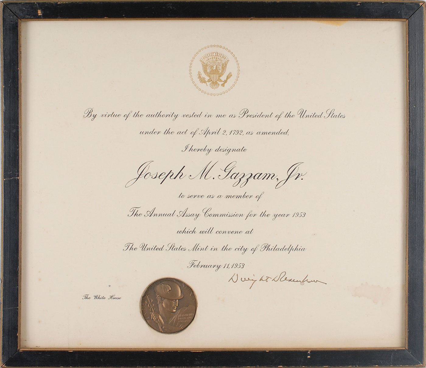 Partly-printed DS, one page, 13.75 x 11.75, February 11, 1953. President Eisenhower designates Joseph M. Gazzam, Jr., to “serve as a member of The Annual Assay Commission for the year 1953 which will convene at The United States Mint in the city of Philadelphia February 11, 1953.” Signed at the conclusion in fountain pen. Document is mounted and the official 1953 Assay Commission bronze medal is set into a circular cutout in the lower left. Framed to an overall size of 15 x 13. In very good condition, with scattered dampstaining and foxing, one water spot affecting a single letter of his signature, and the medal and frame backing somewhat loose.