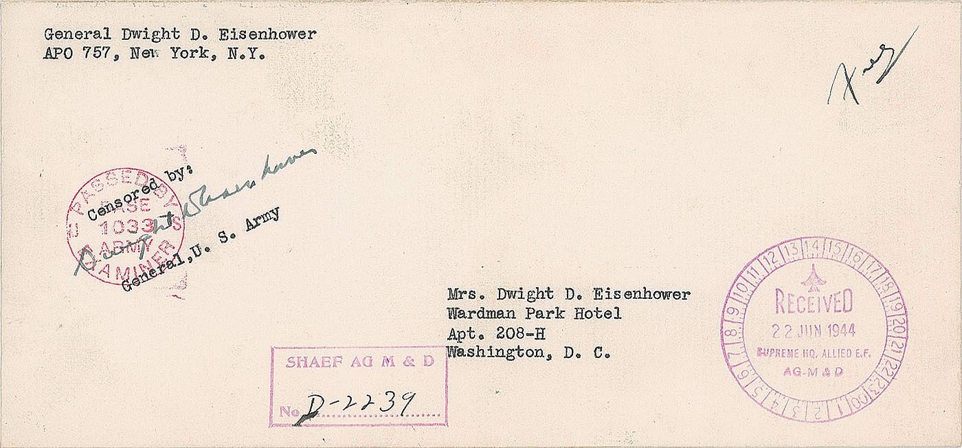 World War II-dated Official Supreme Headquarters, Allied Expeditionary Force mailing envelope, 8.25 x 3.75, addressed in type to his wife at the Wardman Park Hotel in Washington, signed on the left side in fountain pen with a censorship signature, “Dwight D. Eisenhower," who adds "Free" to the upper right corner. Stamped with a received date of June 22, 1944. In fine condition. Accompanied by a certificate of authenticity from The Philatelic Foundation.