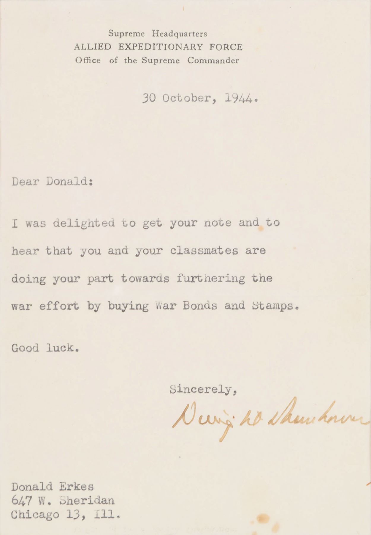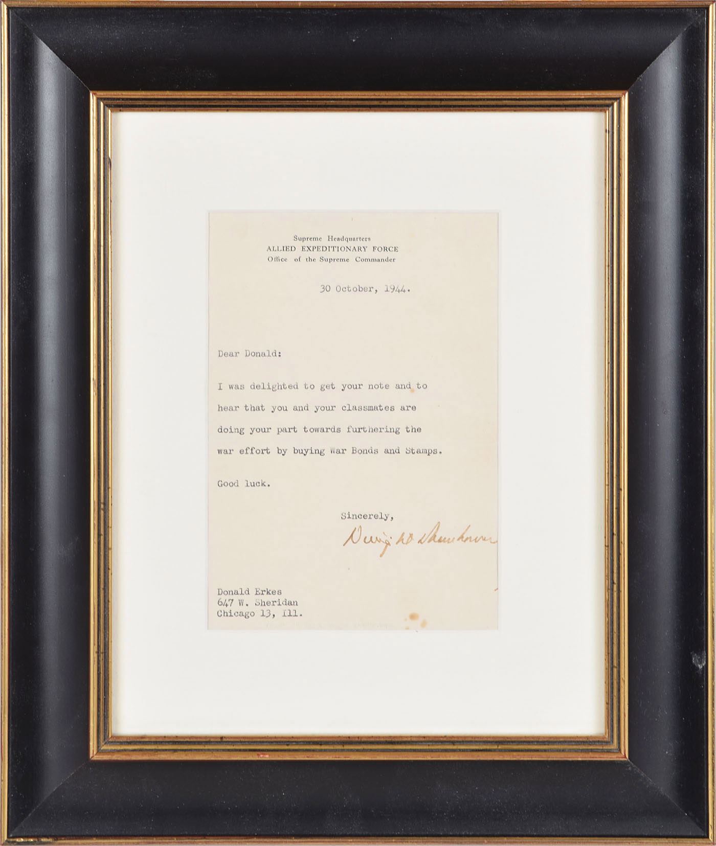 TLS, one page, 4.5 x 6.5, Supreme Headquarters, Allied Expeditionary Force letterhead, October 30, 1944. Letter to Donald Erkes, in full: "I was delighted to get your note and to hear that you and your classmates are doing your part towards furthering the war effort by buying War Bonds and Stamps. Good luck." Matted and framed to an overall size of 11 x 13.25. In fine condition, with some small stains at the bottom. Accompanied by the original mailing envelope.