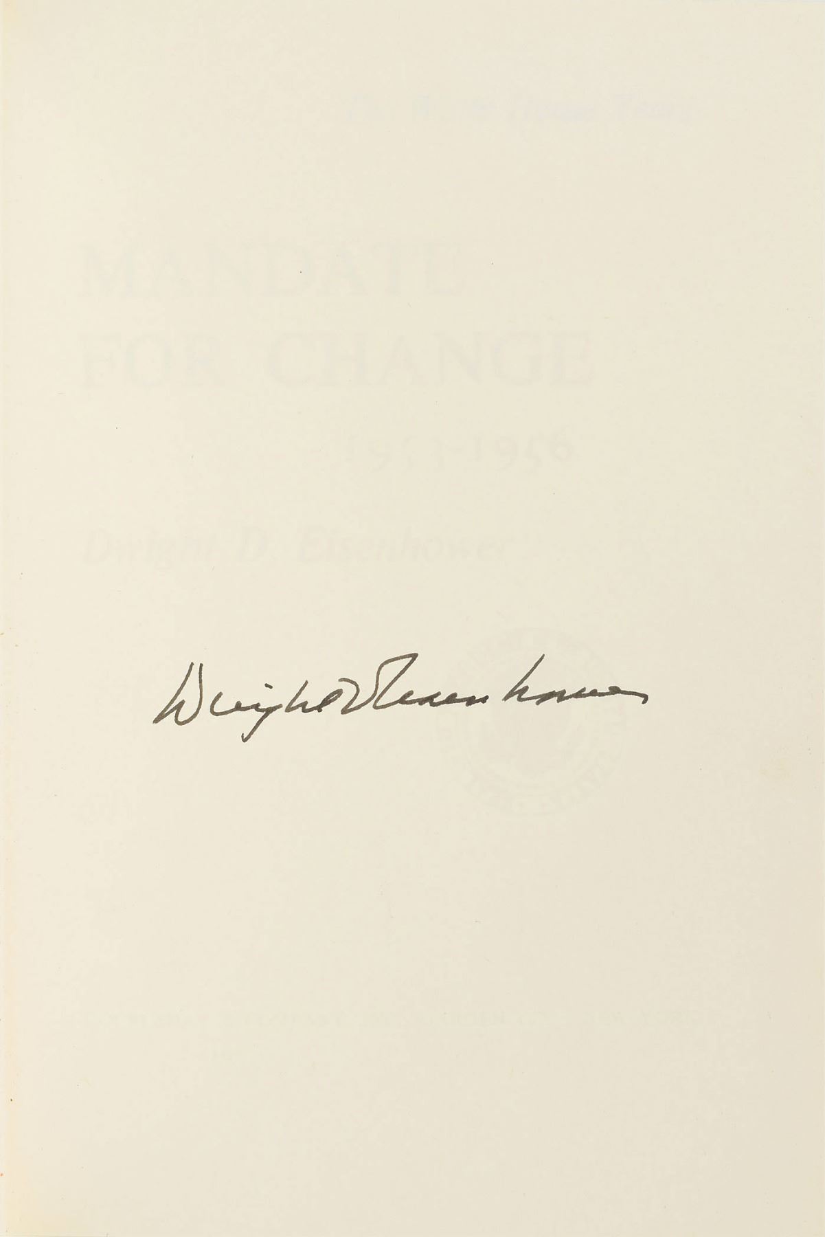 Signed book: The White House Years: Mandate for Change, 1953–1956. Limited edition of 1,500 copies (1,434 signed; this copy No. 1110). Garden City: Doubleday & Company, 1963. Hardcover with slipcase, 6.5 x 9.5, 650 pages. Signed opposite the colophon in black ink, "Dwight D. Eisenhower." In fine condition, with light wear and soiling to the slipcase.