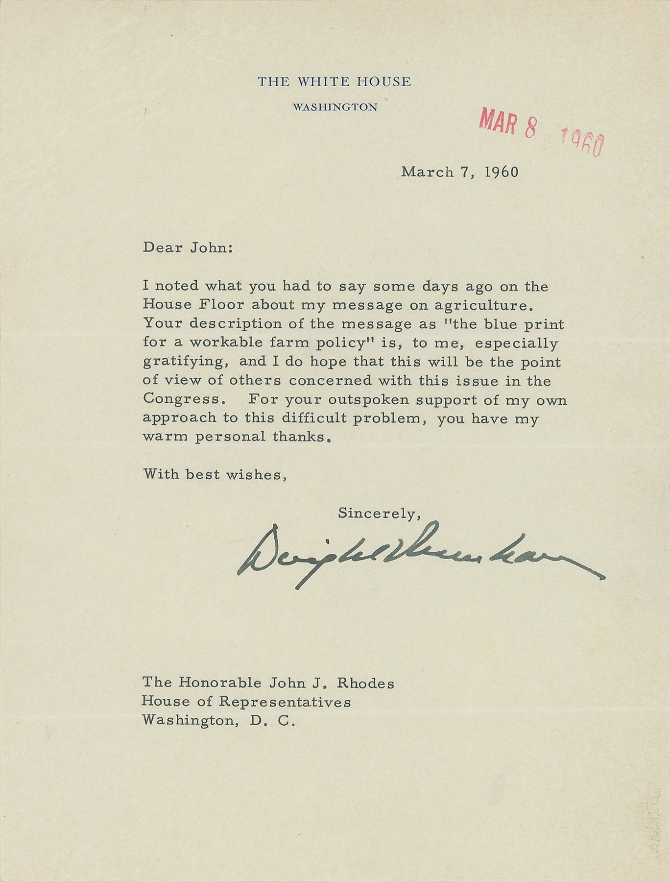 TLS as president, one page, 6.75 x 9, White House letterhead, March 7, 1960. Letter to Congressman John Jacob Rhodes, in full: "I noted what you had to say some days ago on the House Floor about my message on agriculture. Your description of the message as 'the blue print for a workable farm policy' is, to me, especially gratifying, and I do hope that this will be the point of view of others concerned with this issue in the Congress. For your outspoken support of my own approach to this difficult problem, you have my warm personal thanks." In fine condition, with several horizontal folds.