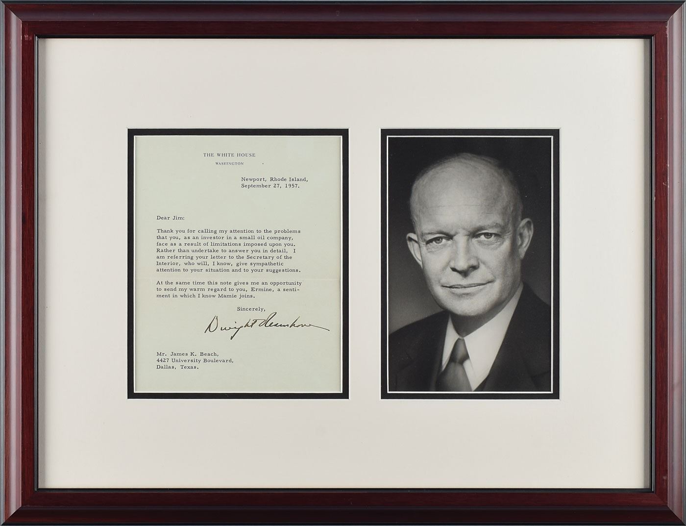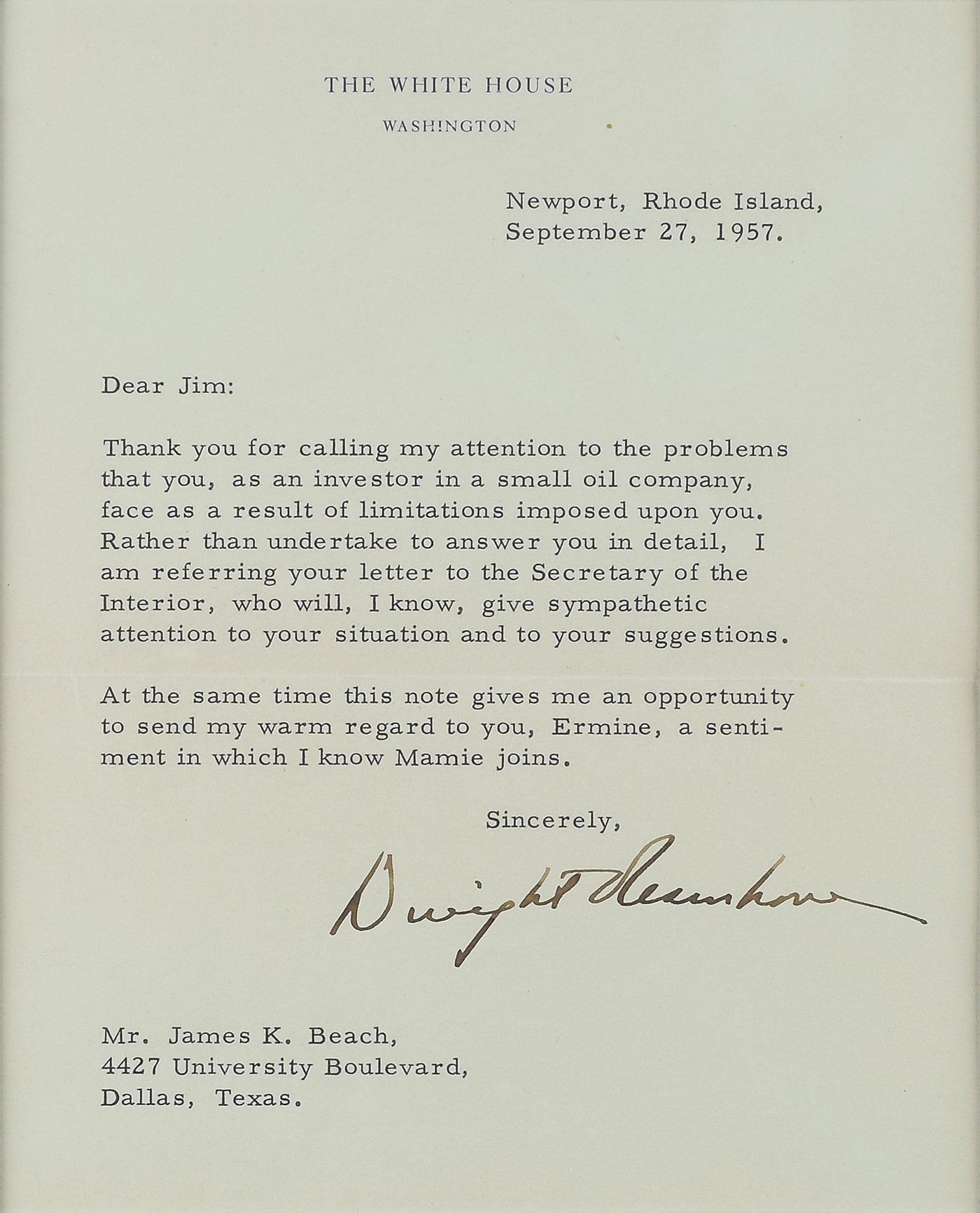 TLS as president, one page, 6 x 7.5, White House letterhead, September 27, 1957. Letter to James K. Beach in Dallas, Texas, in part: "Thank you for calling my attention to the problems that you, as an investor in a small oil company, face as a result of limitations imposed upon you. Rather than undertake to answer you in detail, I am referring your letter to the Secretary of the Interior, who will, I know, give sympathetic attention to your situation and to your suggestions." Double-matted and framed with a portrait to an overall size of 20 x 15.5. In fine condition.