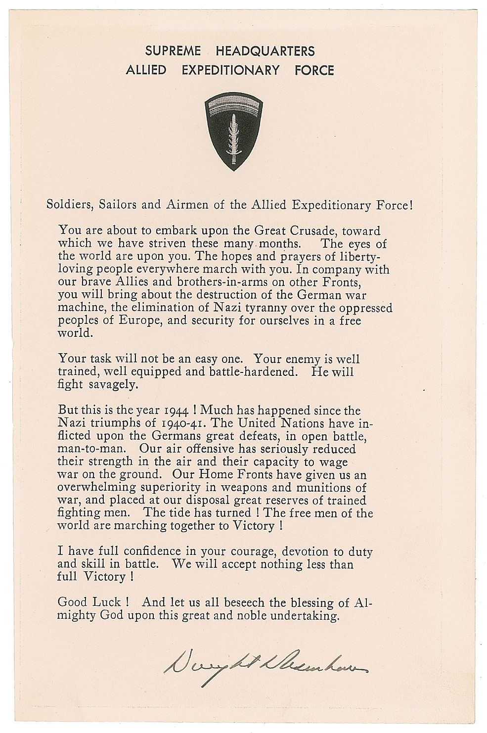 Souvenir typescript of General Dwight Eisenhower’s 'Order of the Day' on June 6, 1944, delivered upon the D-Day invasion of France, 6 x 9.25, removed from one of Eisenhower’s limited edition Crusade in Europe books, signed at the conclusion in fountain pen by Eisenhower. The order reads, in part: “Soldiers, Sailors and Airmen of the Allied Expeditionary Forces: You are about to embark upon the Great Crusade, toward which we have striven these many months. The eyes of the world are upon you. The hopes and prayers of liberty-loving people everywhere march with you…But this is the year 1944! Much has happened since the Nazi triumphs of 1940-41. The United Nations have inflicted upon the Germans great defeats, in open battle, man-to-man. Our air offensive has seriously reduced their strength in the air and their capacity to wage war on the ground. Our Home Fronts have given us an overwhelming superiority in weapons and munitions of war, and placed at our disposal great reserves of trained fighting men. The tide has turned!” In fine condition, with a faint block of toning from prior display.