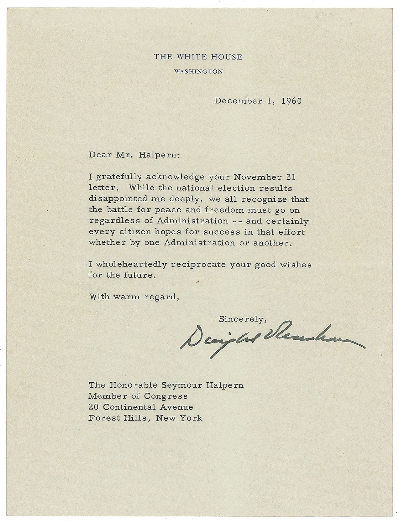 TLS as president, one page, 6.75 x 8.75, White House letterhead, December 1, 1960. Letter to Congressman Seymor Halpern of New York, in part: "I gratefully acknowledge your November 21 letter. While the national election results disappointed me deeply, we all recognize that the battle for peace and freedom must go on regardless of Administration—and certainly every citizen hopes for success in that effort whether by one Administration or another. I wholeheartedly reciprocate your good wishes for the future." In fine condition, with a few light creases. A desirable letter with historic content on the 1960 presidential election, in which John F. Kennedy defeated Ike's vice president, Richard Nixon, in a memorable campaign. His sentiments expressing support for America—despite disappointment in the administration—evoke a bygone era of bipartisanship.