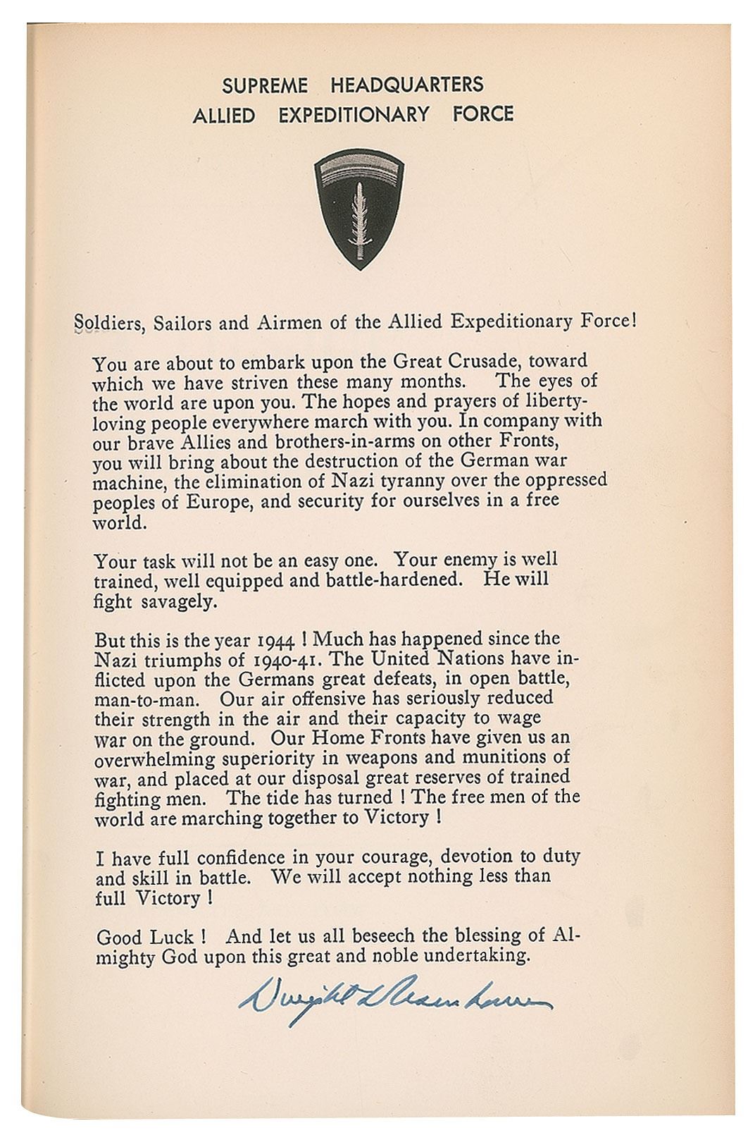 Signed book: Crusade in Europe. First edition, limited issue, numbered 324/1426. Garden City, NY: Doubleday, 1948. Hardcover with acetate jacket and slipcase, 6.75 x 9.75, 559 pages. Signed in fountain pen on a special prefatory page reproducing Eisenhower’s ‘Order of the Day’ on D-Day, “Dwight D. Eisenhower.” Autographic condition: very fine. Book condition: NF in a VG slipcase, with noticeable chipping and partial splitting to slipcase edges.