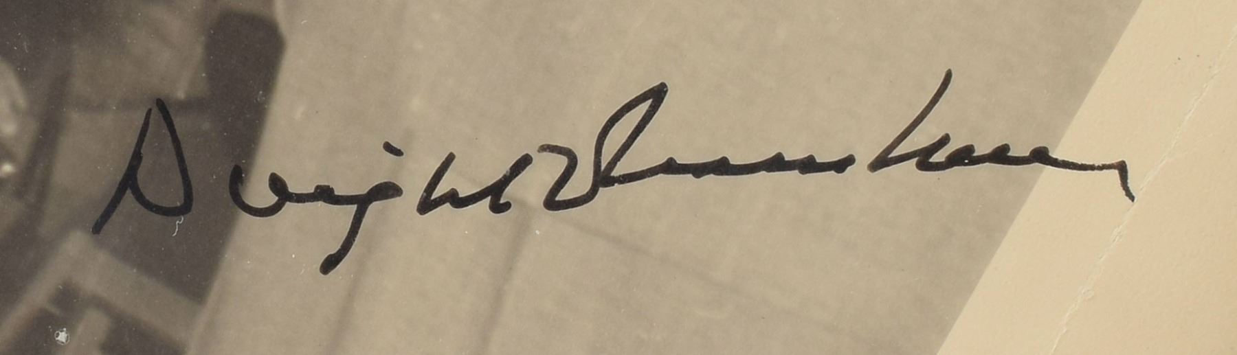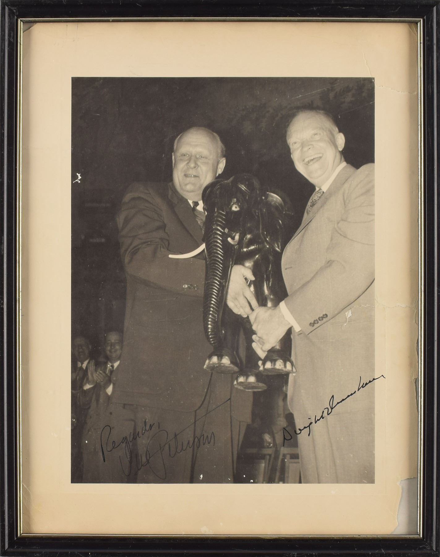 Vintage matte-finish 10.5 x 13.5 photo of Republican nominee Dwight Eisenhower holding an elephant statue with Nebraska Governor Val Peterson during the former's 1952 presidential campaign, signed in fountain pen, "Dwight D. Eisenhower" and "Regards, Val Peterson." Framed to a slightly larger size. Collector's notations to frame backing indicate that the photo was signed in Gettysburg in 1963. In very good condition, with some flecks of emulsion loss, creasing and tears to the borders, and paper loss to the lower right corner area.
