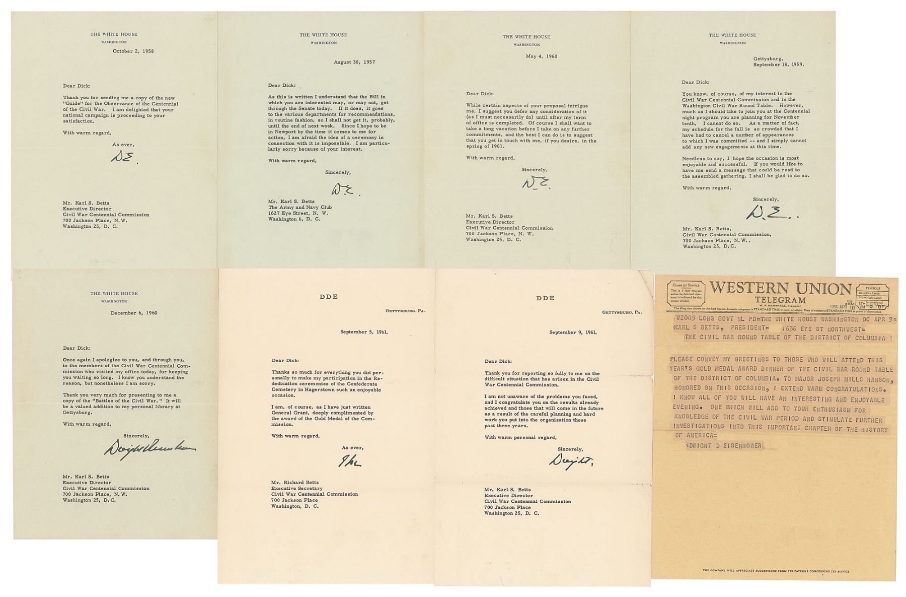 Collection of seven TLSs from Dwight D. Eisenhower, each signed “D.E.,” “Ike,” “Dwight,” or “Dwight D. Eisenhower,” each one page, ranging in size from 6.75 x 9 to 7.25 x 10.5, dated between 1957 and 1961. All letters are addressed to Karl Betts, the first executive director of the Civil War Centennial Commission, with subject matter relating to events of the ongoing centennial celebration. Highlights from the archive include: