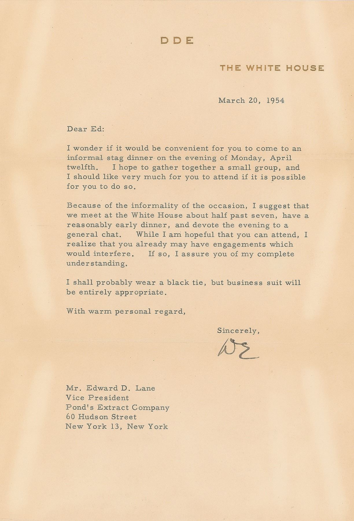 TLS as president, signed “DE,” one page, 7 x 10.25, personal White House letterhead, March 20, 1954. Letter to Edward D. Lane of Pond's Extract Company, in full: "I wonder if it would be convenient for you to come to an informal stag dinner on the evening of Monday, April twelfth. I hope to gather together a small group, and I should like very much for you to attend if it is possible for you to do so. Because of the informality of the occasion, I suggest that we meet at the White House about half past seven, have a reasonably early dinner, and devote the evening to a general chat. While I am hopeful that you can attend, I realize that you already may have engagements which would interfere. If so, I assure you of my complete understanding. I shall probably wear a black tie, but business suit will be entirely appropriate." In very good to fine condition, with irregular toning. Accompanied by the original mailing envelope.