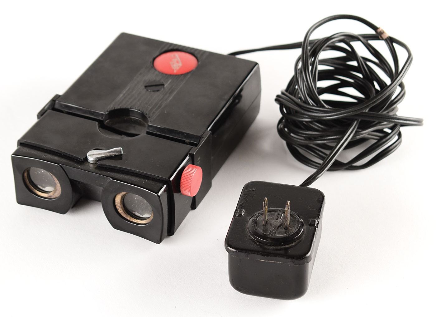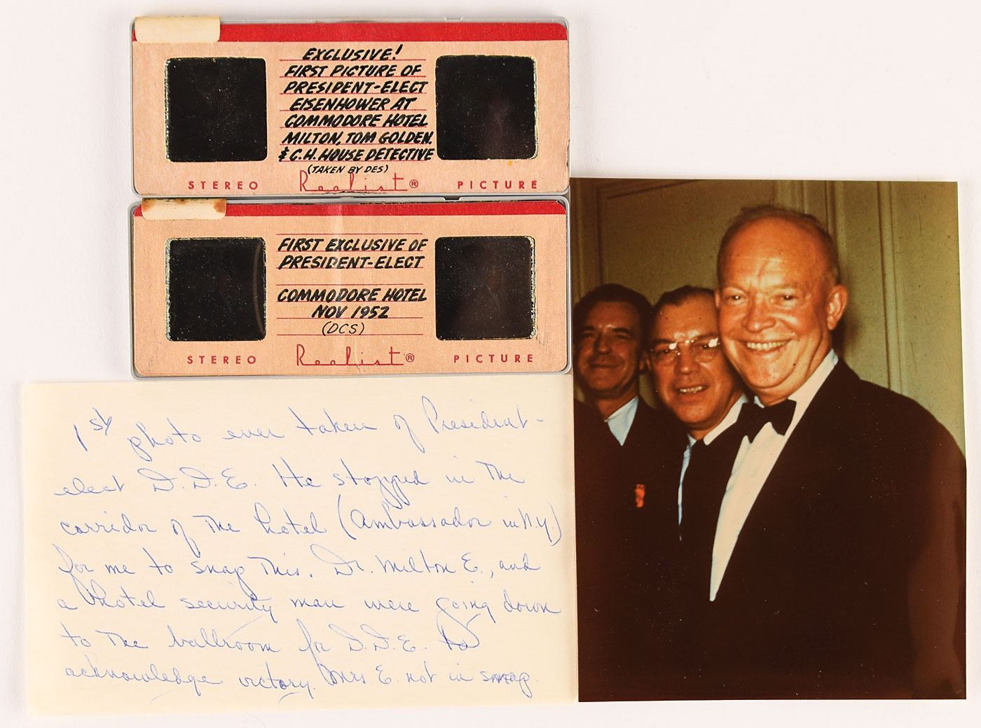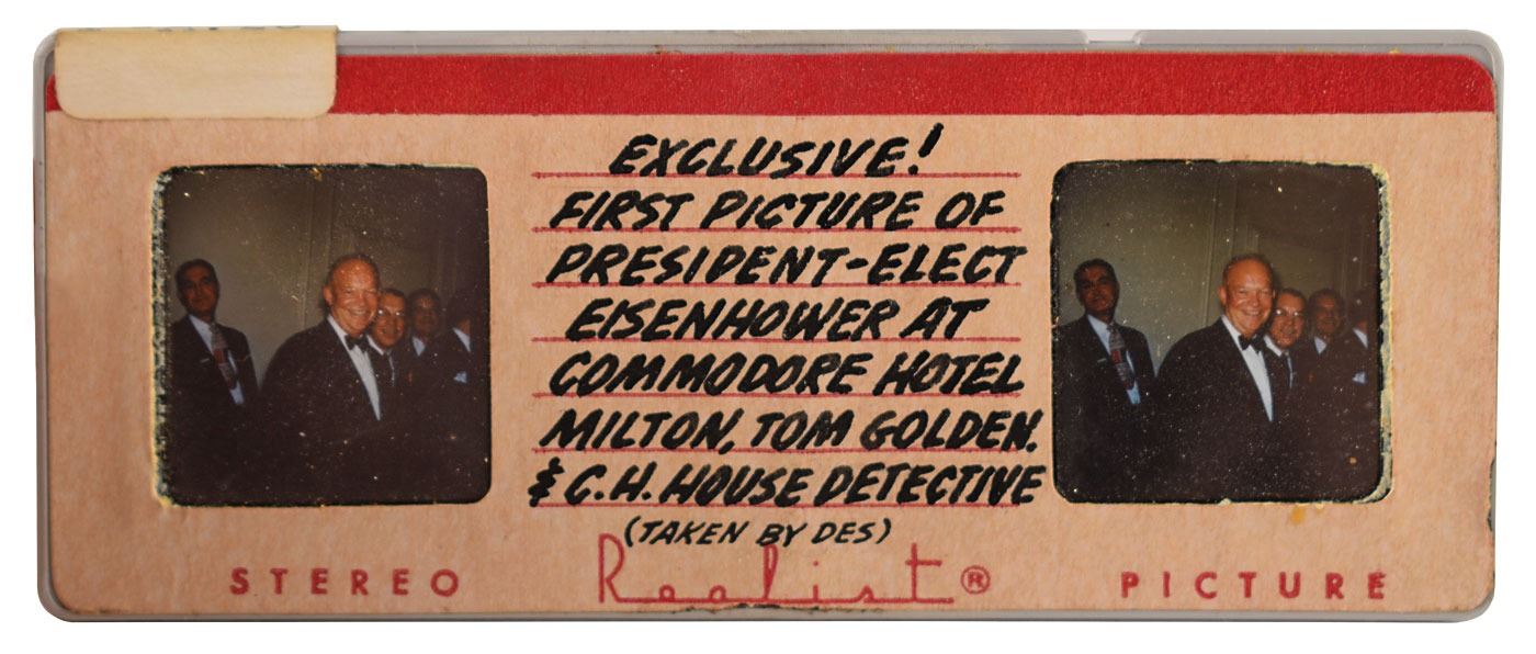 Two identical vintage color Stereo Realist camera slides of Dwight D. Eisenhower at New York's Commodore Hotel following his sweeping victory in the 1952 presidential election, taken by the wife of his aide Robert L. Schulz, measuring 4 x 1.5, with central annotations reading: "First Exclusive of President-Elect, Commodore Hotel, Nov 1952, (DCS)" and "Exclusive! First picture of President-Elect Eisenhower at Commodore Hotel, Milton, Tom Golden, & C. H. House Detective, (Taken by DES)." Includes a vintage Stereo Realist 'red button' viewer, allowing the slides to be viewed as three-dimensional stereographs.