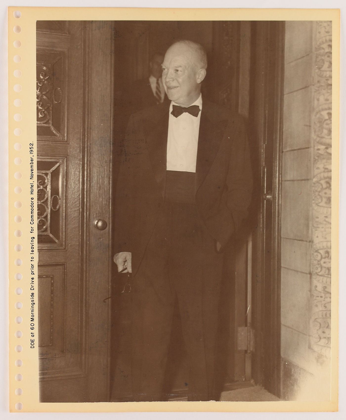 Also includes a separate print of the photograph with a handwritten note by Dorothy Schulz: "1st photo ever taken of President-elect D.D.E. He stayed in the corridor of the hotel (Ambassador [sic, Commodore] in N.Y.) for me to snap this. Dr. Milton E., and a hotel security man were going down to the ballroom for D.D.E. to acknowledge his victory." In overall fine condition.