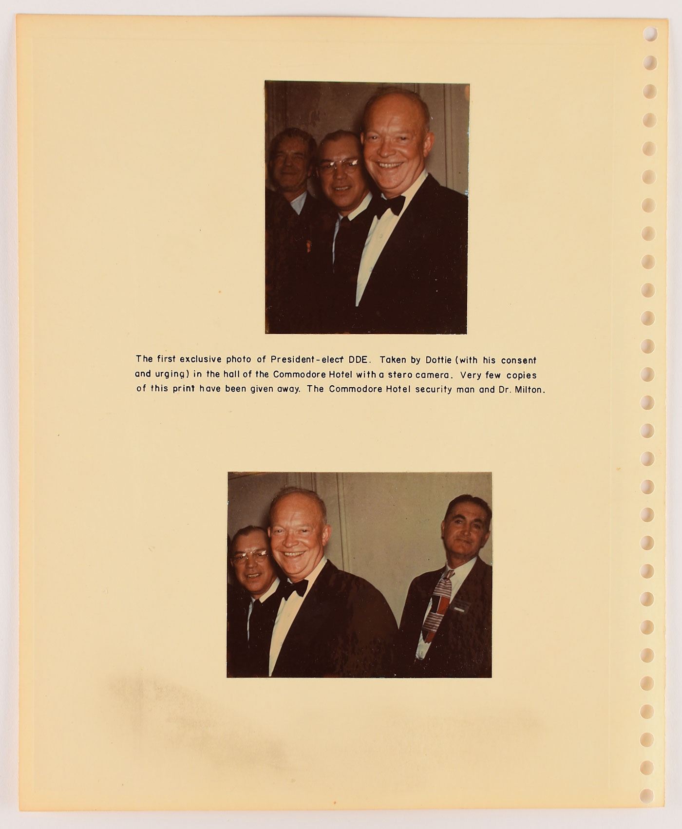 Also accompanied by an 11.5 x 14 page from the Schulz family scrapbook, bearing affixed prints of the image and an explanatory caption: "The first exclusive photo of President-elect DDE. Taken by Dottie (with his consent and urging) in the hall of the Commodore Hotel with a stereo camera. Very few copies of this print have been given away. The Commodore Hotel security man and Dr. Milton"; on the reverse is a large portrait of Eisenhower at "60 Morningside Drive prior to leaving for Commodore Hotel, 1952."