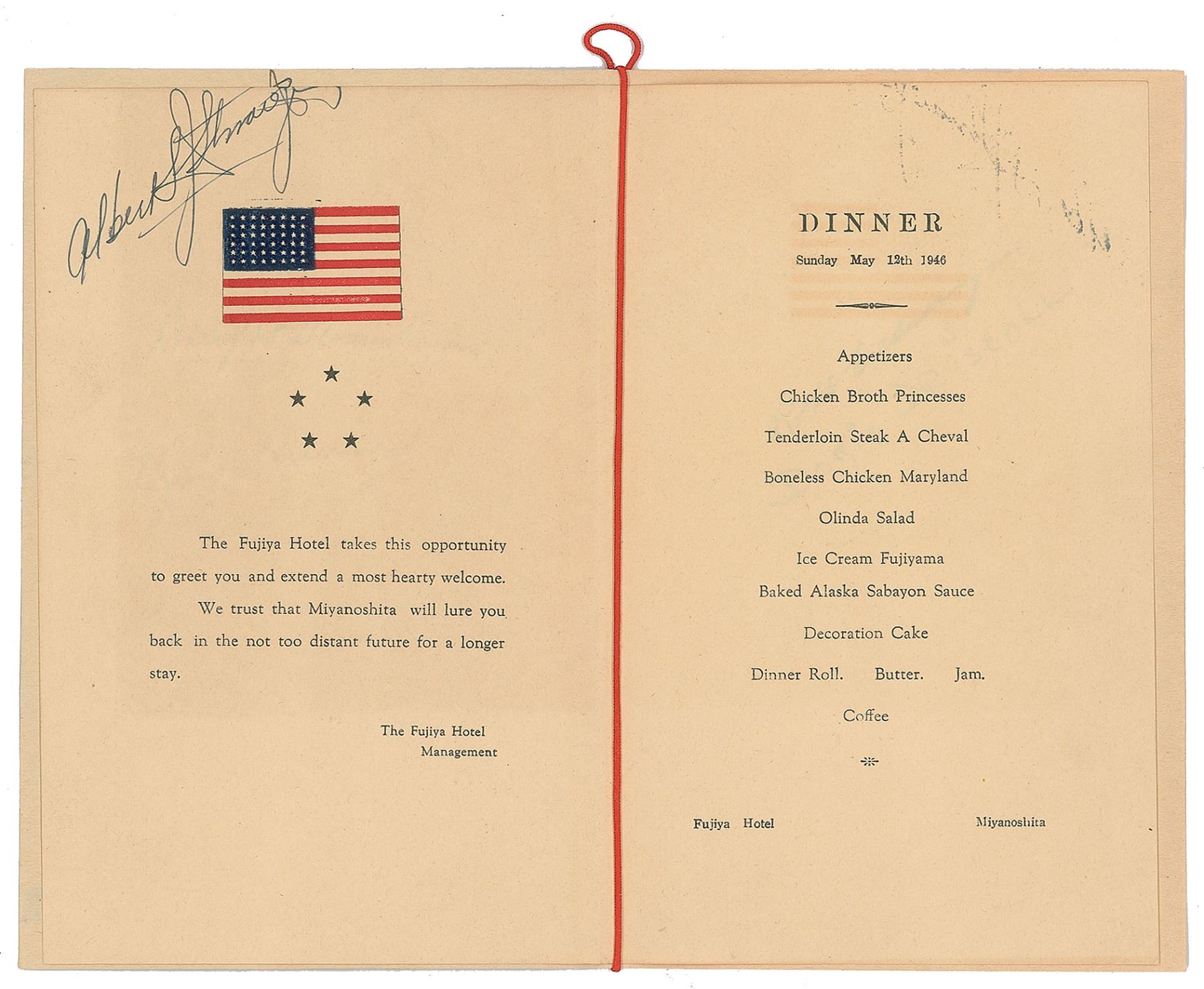 Menu for a dinner at the Fujiya Hotel in Miyanoshita, Japan, on May 12, 1946, 5 x 8, signed inside in fountain pen by Eisenhower and four other dinner guests. In fine condition.