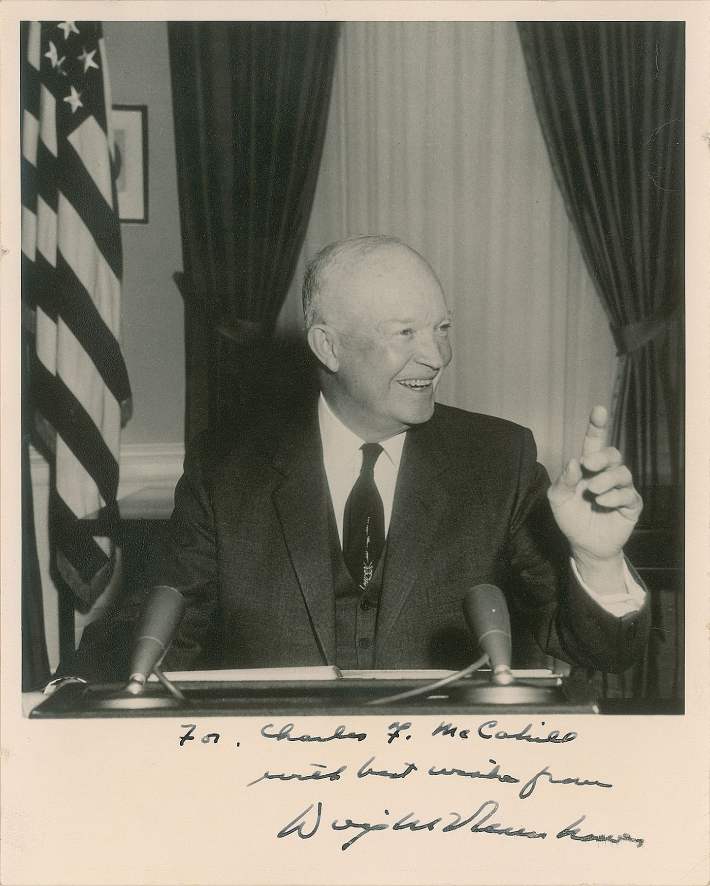 Vintage matte-finish 8 x 10 photo of President Eisenhower behind two microphones, signed and inscribed in the lower border in fountain pen, "For Charles F. McCahill, with best wishes from Dwight D. Eisenhower.” Reverse bears an Abbie Rowe credit stamp. In fine condition, with a circular postal impression to the upper right side, and a tiny dent to the left border.