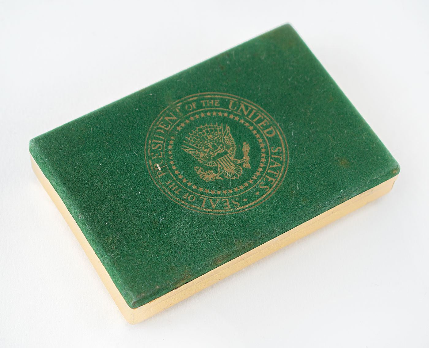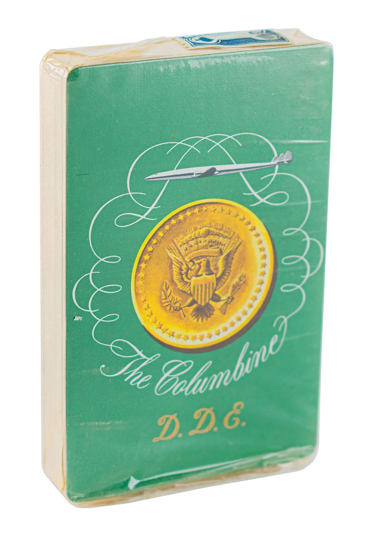 Deck of playing cards from Dwight D. Eisenhower's presidential plane, The Columbine, sealed in plastic and presented in its original box with the presidential seal emblazoned in gold on the green velvet lid. In fine condition.