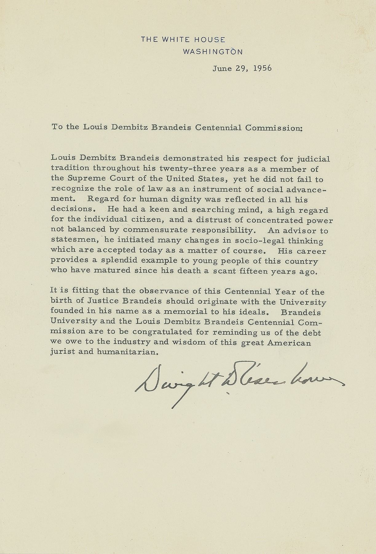 TLS as president, one page, 7 x 10.5, White House letterhead, June 29, 1956. Letter to "the Louis Dembitz Brandeis Centennial Commission," in full: "Louis Dembitz Brandeis demonstrated his respect for judicial tradition throughout his twenty-three years as a member of the Supreme Court of the United States, yet he did not fail to recognize the role of law as an instrument of social advancement. Regard for human dignity was reflected in all his decisions. He had a keen and searching mind, a high regard for the individual citizen, and a distrust of concentrated power not balanced by commensurate responsibility. An advisor to statesmen, he initiated many changes in socio-legal thinking which are accepted today as a matter of course. His career provides a splendid example to young people of this country who have matured since his death a scant fifteen years ago.