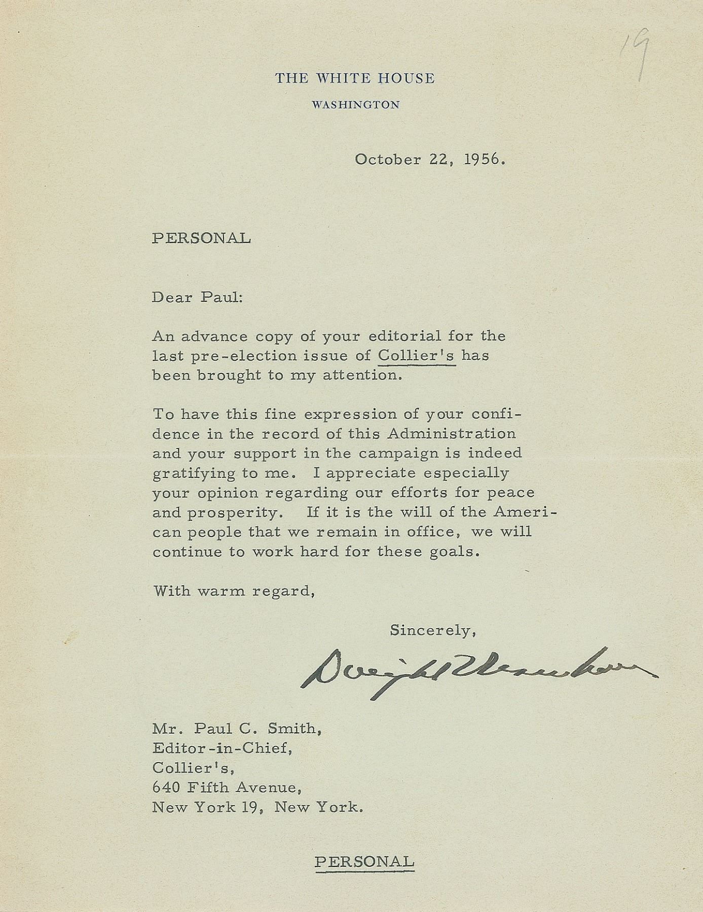 TLS as president, one page, 6.75 x 8.75, White House letterhead, October 22, 1956. Letter marked “Personal” and addressed to Paul C. Smith, the editor-in-chief of Collier’s, in full: “An advanced copy of the editorial for the last pre-election issue of Collier’s has been brought to my attention. To have this fine expression of your confidence in the record of this Administration and your support in the campaign is indeed gratifying to me. I appreciate especially your opinion regarding our effort for peace and prosperity. It is the will of the American people that we remain in office, we will continue to work hard for these goals.” In very good to fine condition, with two light diagonal creases.