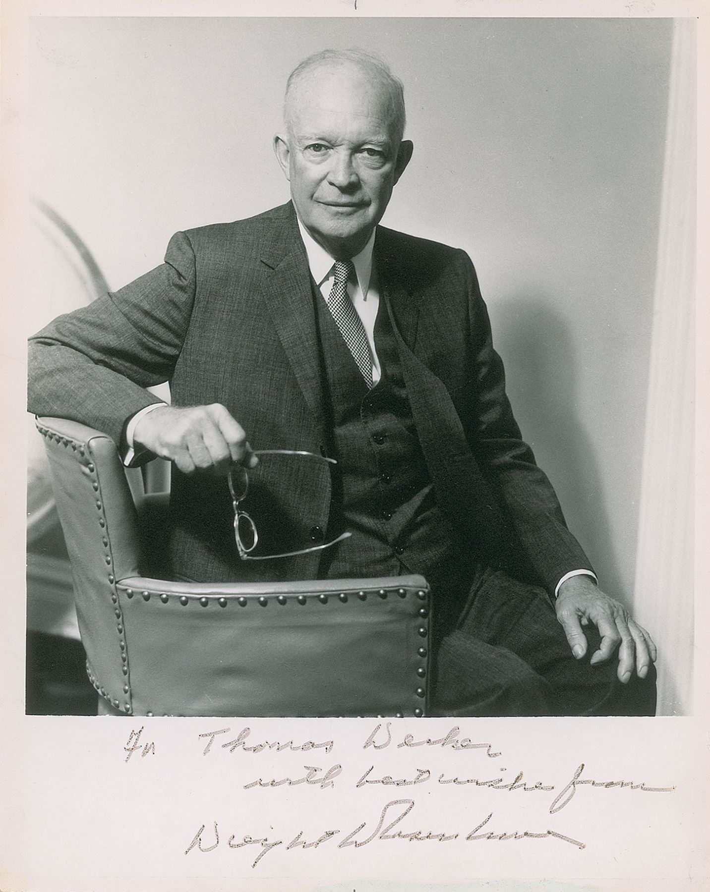 Vintage matte-finish 8 x 10 photo of Eisenhower holding his glasses in a pleasant seated pose, signed and inscribed in the lower border in black ink, "For Thomas Decker, with best wishes from, Dwight D. Eisenhower.” Reverse stamped: "Photo by J. Anthony Wills, Houston, Texas, Reproduction by U.S. Army." In fine condition.