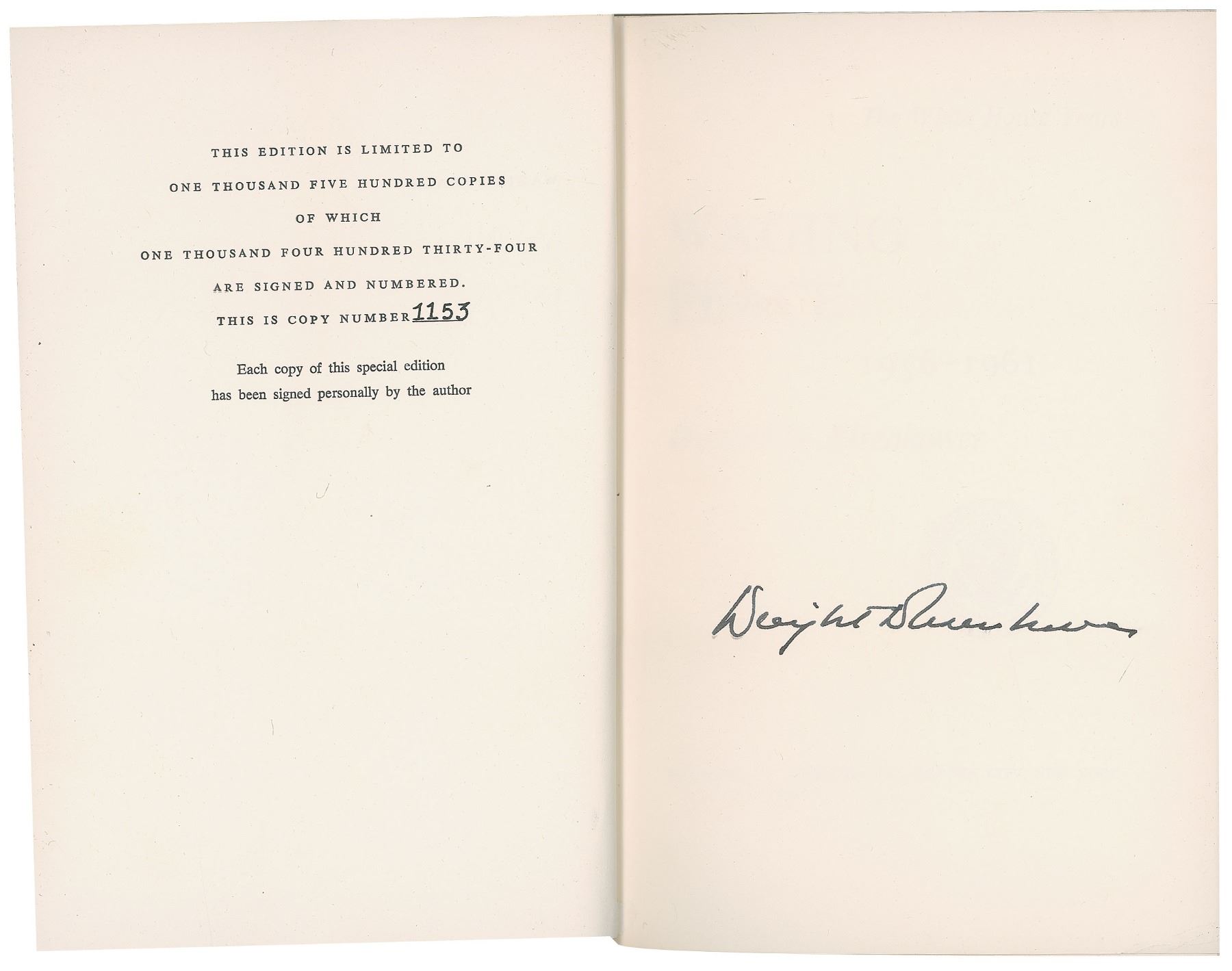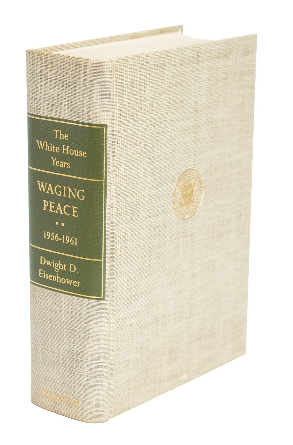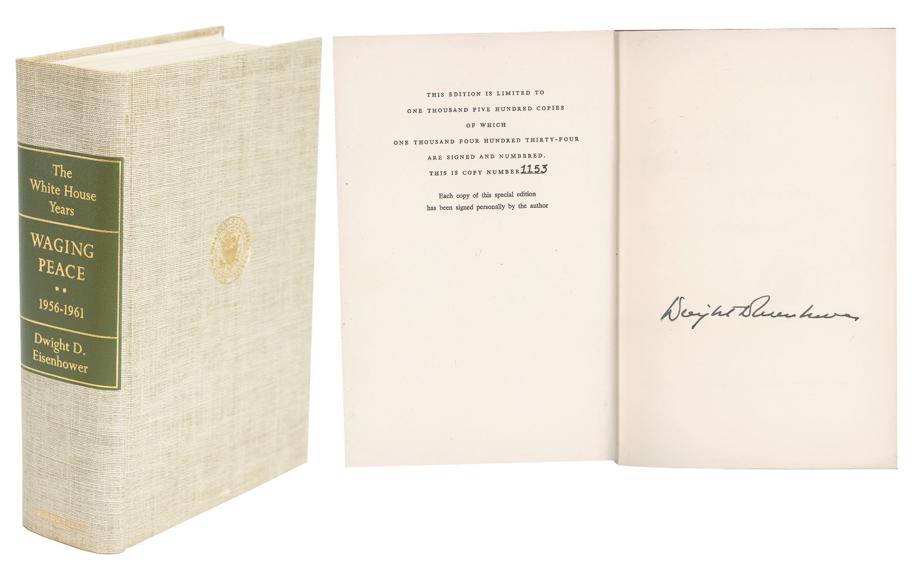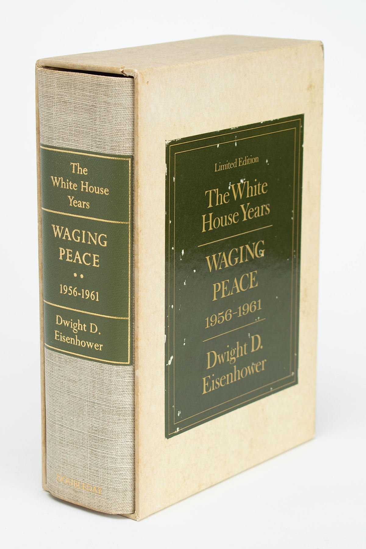 Signed book: The White House Years: Waging Peace, 1956–1961. First edition, limited issue, numbered 1153/1500. Garden City, NY: Doubleday, 1965. Hardcover with slipcase, 7 x 9.75, 741 pages. Signed opposite the colophon in black felt tip, "Dwight D. Eisenhower." Autographic condition: very good to fine, with central vertical bends through the colophon and signed page. Book condition: VG/None in a VG slipcase, with scuffing to the title panel on the case.