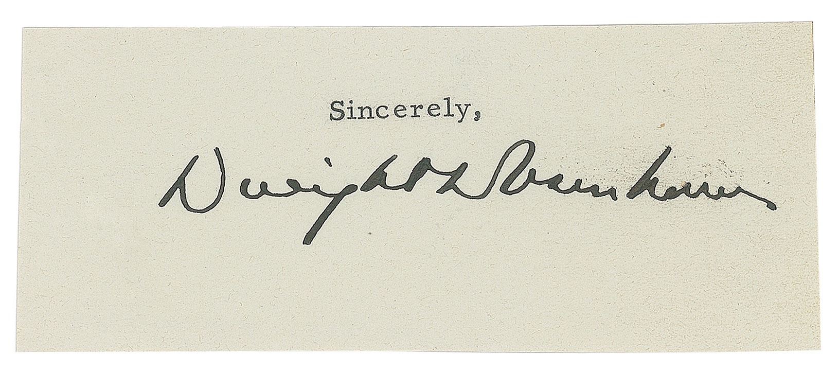 Fountain pen signature as president, "Dwight D. Eisenhower,” on an off-white 4.25 x 1.75 slip, annotated on the reverse in pencil with a date of March 11, 1953. In fine condition.